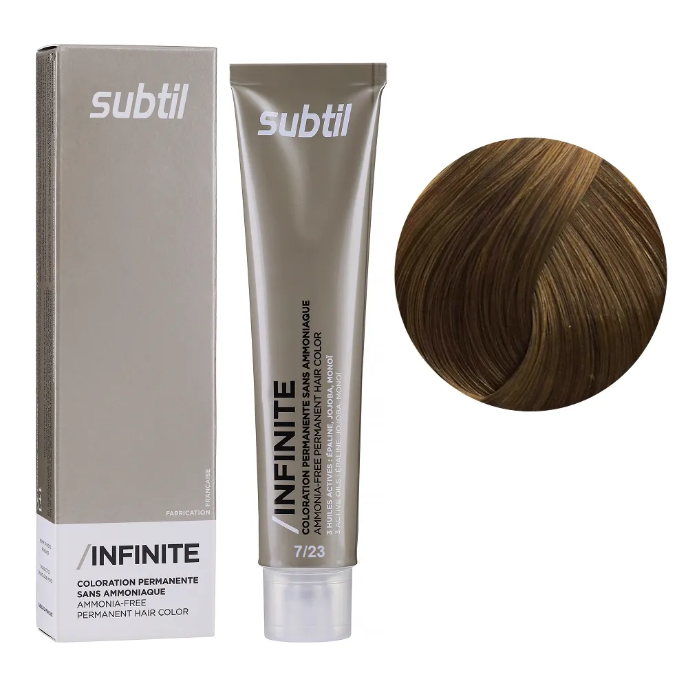 Subtil Infinite - фарба без вмісту аміаку нового покоління, що містить щонайменше 78% інгредієнтів природного походження та трилогію дорогоцінних олій: жожоба, моної, кукурудзяної. Забезпечує 100% зафарбовування сивини, супер блиск та супер стійкість. Безаміачна фарба додає волоссю стійкий і насичений колір, при цьому не ушкоджує і не висушує його. Олії, що входять до складу зволожують і ущільнюють волосся, роблять його блискучим і шовковистим. Щадна формула підходить навіть власницям чутливої шкіри голови. Так само фарба здатна освітлити волосся до трьох рівнів, що є революцією в світі безаміачних фарб. Розкішний колір, гладкість і здоровий блиск без шкоди для волосся. Застосування: 7/23 блондин перламутрово-золотистий Безаміачна стійка крем-фарба для волосся, 60 мл Permanent Hair Color INFINITE SUBTIL Крем-фарбу потрібно наносити на брудне сухе волосся. Фарбу слід змивати ретельно до повної прозорості води. Час витримки: 7/23 блондин перламутрово-золотистий Безаміачна стійка крем-фарба для волосся, 60 мл Permanent Hair Color INFINITE SUBTIL Витримати на волоссі від 30 до 35 хвилин, при наявності сивого волосся час впливу можна збільшити на 10 хвилин. Застосовувати фарбу слід, суворо дотримуючись інструкції, яка додається до кожної упаковки.Безаміачна стійка крем-фарба для волосся Permanent Hair Color INFINITE SUBTIL