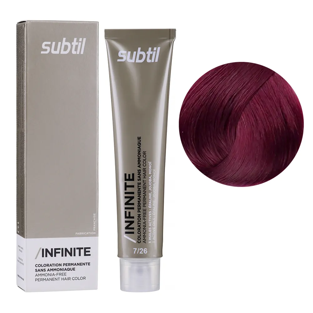 Subtil Infinite - фарба без вмісту аміаку нового покоління, що містить щонайменше 78% інгредієнтів природного походження та трилогію дорогоцінних олій: жожоба, моної, кукурудзяної. Забезпечує 100% зафарбовування сивини, супер блиск та супер стійкість. Безаміачна фарба додає волоссю стійкий і насичений колір, при цьому не ушкоджує і не висушує його. Олії, що входять до складу зволожують і ущільнюють волосся, роблять його блискучим і шовковистим. Щадна формула підходить навіть власницям чутливої шкіри голови. Так само фарба здатна освітлити волосся до трьох рівнів, що є революцією в світі безаміачних фарб. Розкішний колір, гладкість і здоровий блиск без шкоди для волосся. Застосування: 7/26 блондин перламутровий червоний Безаміачна стійка крем-фарба для волосся, 60 мл Permanent Hair Color INFINITE SUBTIL Крем-фарбу потрібно наносити на брудне сухе волосся. Фарбу слід змивати ретельно до повної прозорості води. Час витримки: 7/26 блондин перламутровий червоний Безаміачна стійка крем-фарба для волосся, 60 мл Permanent Hair Color INFINITE SUBTIL Витримати на волоссі від 30 до 35 хвилин, при наявності сивого волосся час впливу можна збільшити на 10 хвилин. Застосовувати фарбу слід, суворо дотримуючись інструкції, яка додається до кожної упаковки.Безаміачна стійка крем-фарба для волосся Permanent Hair Color INFINITE SUBTIL