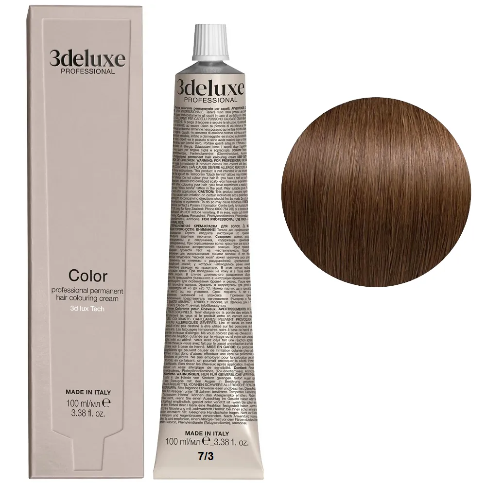 Професійна стійка кремова фарба для волосся Permanent Hair Color 3deluxe з неймовірним відбиттям світла та чудовим захистом, забезпечує волоссю неперевершену якість. Містить технологію 3D Lux, яка забезпечує насичений, яскравий, багатогранний колір: Особливості продукту: 7/3 блондин золотистий Фарба для волосся, 100 мл Permanent Hair Color 3deluxe Professional Активні компоненти: 7/3 блондин золотистий Фарба для волосся, 100 мл Permanent Hair Color 3deluxe Professional Застосування: 7/3 блондин золотистий Фарба для волосся, 100 мл Permanent Hair Color 3deluxe Professional Змішайте в пластмасовому посуді крему-фарбу Color 3deluxe з кремом-окислювачем 1,5%, 3%, 6%, 9% або 12%. Пропорції змішування: для основної палітри відтінків - 1:1,5, для освітлювального ряду - 1:2, для більш насиченого кольору - 1:1. Час витримки залежить від бажаного результату. Важливо! Продукт для професійного застосування. Уважно ознайомтесь з інструкцією.Фарба для волосся Permanent Hair Color 3deluxe Professional