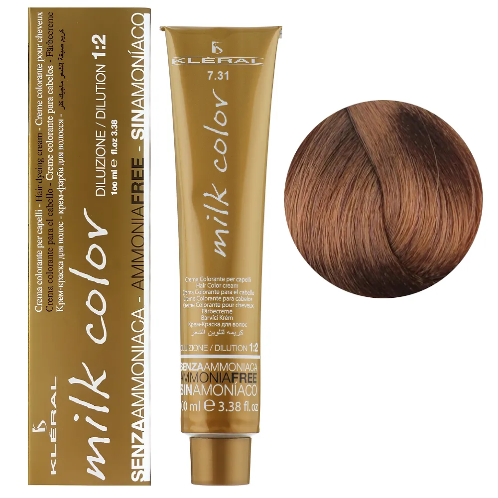 Безаміачна фарба Milk Color, розроблена італійською компанією Kleral System, представлена більше ніж 40 відтінками. Прекрасно забарвлює волосся, у тому числі і сиве (якщо сивини не більше 50%) у близькі до натуральних кольорів. Завдяки своєму щадному складу і компонентам, що доглядають, не пошкоджує структуру волосся, надає їм блиск і м`якість. Milk Color ідеально підходить для пошкодженого волосся. Тюбик містить 100 мл фарби та розрахований на 2 повні нанесення. Рекомендований окислювач - 20-vol стабілізований перекис водню. Для збільшення освітлювальної дії, використовуйте стабілізований перекис водню в 30- або 40-vol емульсії. Особливості продукту: 7/31 Бежевий блонд Крем-фарба для волосся перманентна без аміаку, 100 мл Milk Color KLERAL System Застосування: 7/31 Бежевий блонд Крем-фарба для волосся перманентна без аміаку, 100 мл Milk Color KLERAL System Продукт призначений для професійного використання. Уважно ознайомтесь з інструкцією.Крем-фарба для волосся перманентна без аміаку Milk Color KLERAL System