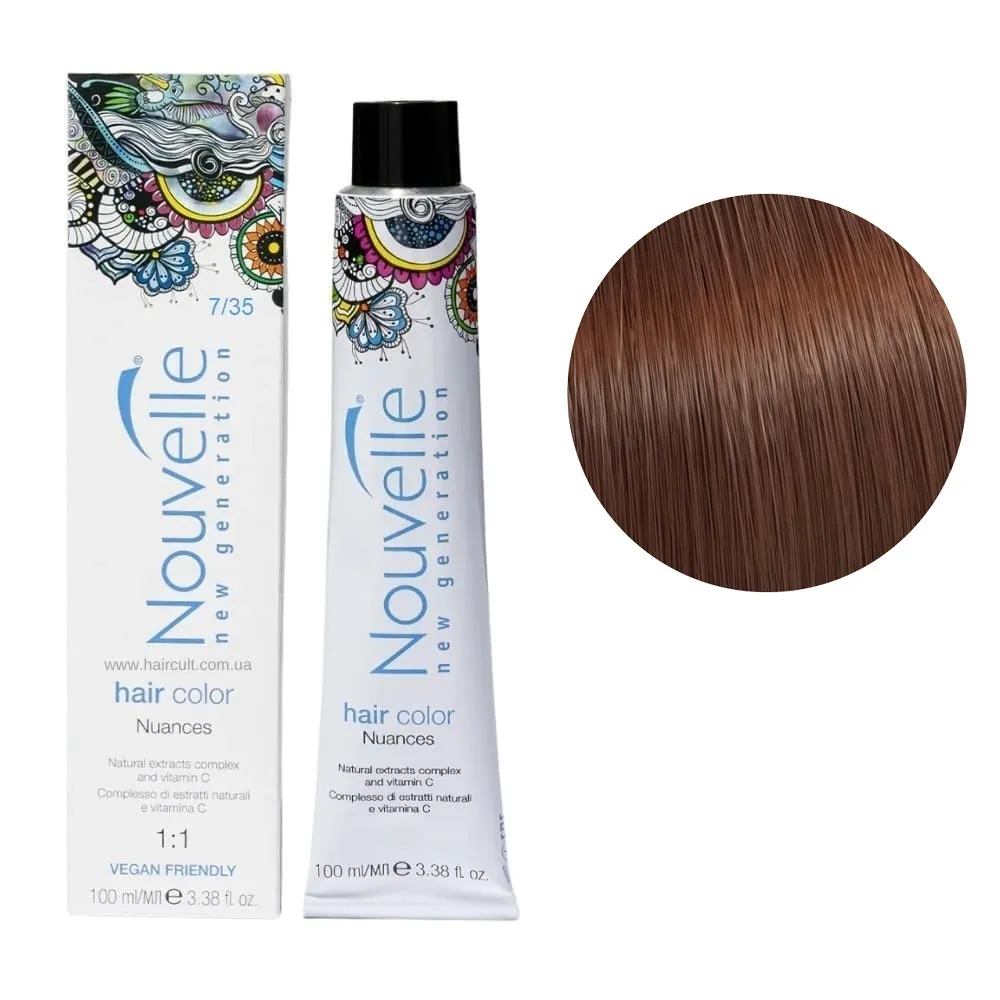 Nouvelle New Generation Hair Color - це стійка аміачна крем-фарба для волосся, яка забезпечує насичений, тривалий колір і професійний результат. Продукт пропонує широку палітру, що включає натуральні, яскраві, модні та ультрасвітлі тони. Особливості продукту: 7/35 середньо-золотистий русявий червоного дерева Фарба для волосся перманентна, 100мл Permanent Hair Color Nouvelle Застосування: 7/35 середньо-золотистий русявий червоного дерева Фарба для волосся перманентна, 100мл Permanent Hair Color Nouvelle Фарбу змішують із окислювачем Nouvelle Developer Cream Peroxide (1,5%, 3%, 6%, 9% або 12%) у відповідних пропорціях залежно від бажаного ефекту: тонування, освітлення чи зафарбовування сивини. Суміш наноситься на сухе, немите волосся із витримкою 25-50 хвилин, залежно від інтенсивності кольору. Після фарбування рекомендується використовувати шампунь і доглядові засоби з серії Nouvelle Color Glow для збереження кольору і здоров’я волосся.Фарба для волосся перманентна Permanent Hair Color Nouvelle