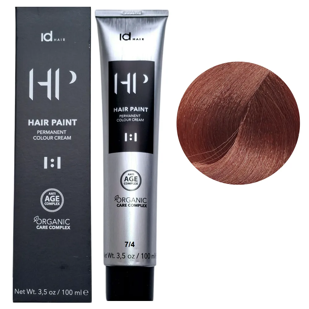 Фарба для волосся Hair Paint OCC ID Hair – це професійні фарбники для волосся з безліччю чудових, м’яких відтінків, які оптимально підходять для всіх типів волосся. Тепер демі-, семі- та перманентне фарбування доступно завдяки лише одному продукту. Фарба містить до 70% менше аміаку порівняно з іншими системами фарбування, що мінімізує ризик подразнення шкіри голови. Низький вміст аміаку у фарбі дозволяє легко використовувати фарбу для волосся з чутливою шкірою голови. Фарба включає комплекс органічного догляду (Organic Care Complex-OCC), що складається з трьох інгредієнтів: Технологія Anti-Ageing Complex не лише подовжує стійкість кольору, але й допомагає боротися з ознаками старіння волосся, гарантуючи, що волосся ваших клієнтів залишатиметься молодим та повним життя. Особливості продукту: 7/4 Крем-фарба для волосся перманентна,100мл HAIR PAINT Permanent Colour Cream OCC Id HAIR Застосування: 7/4 Крем-фарба для волосся перманентна,100мл HAIR PAINT Permanent Colour Cream OCC Id HAIR Змішати в неметалевому посуді крем-фарбу Hair Paint OCC ID Hair із окислювальною емульсією HP BOOSTER ID Hair у пропорції 1 : 1. При інтенсивному освітленні збільшити порцію HP BOOSTER ID Hair вдвічі (1 : 2). Вибір концентрації окислювача 1,5%, 3%, 6%, 9% або 12% залежить від бажаного рівня освітлення. Час витримки: від 30 хвилин. Продукт призначений для професійного використання. Уважно ознайомтесь з інструкцією.Крем-фарба для волосся перманентна HAIR PAINT Permanent Colour Cream OCC Id HAIR