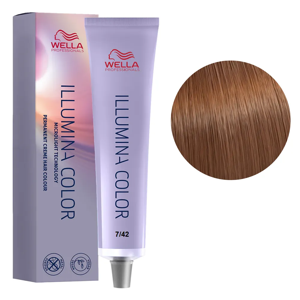 Формула фарби ILLUMINA COLOR заснована на запатентованій технології MICROLIGHT, яка захищає кутикулу волосся та не перевантажує його. Дана технологія обволікає мідні частки на поверхні кутикули, що перешкоджає їх взаємодії з фарбувальної сумішшю і підвищує тим самим захист лускатого шару. Це дозволяє променям світла вільно проникати всередину волосся та надає природним переливам кольору неймовірного сяйва, яке помітно при будь-якому освітленні. Всі тони поєднуються між собою, їх можна змішувати та створювати свій неповторний стиль. Фарба чудово підходить для першого досвіду для клієнтів, які бояться фарбування волосся. Особливості продукту: 7/42 середній блондин червоний матовий Стійка крем-фарба для волосся, 60 мл ILLUMINA COLOR Wella Professionals Застосування: 7/42 середній блондин червоний матовий Стійка крем-фарба для волосся, 60 мл ILLUMINA COLOR Wella Professionals Змішати в неметалевому посуді крем-фарбу ILLUMINA COLOR Wella Professionals із оксидантом WELLOXON PERFECT Wella Professionals у пропорції 1:1 (60 мл фарби + 60 мл оксиданту). Фарбуючу суміш наносити на сухе волосся. Час витримки: до 40 хвилин (до 25 хвилин з підігрівом) Продукт призначений для професійного використання. Уважно ознайомтесь з інструкцією.Стійка крем-фарба для волосся, 60 мл ILLUMINA COLOR Wella Professionals
