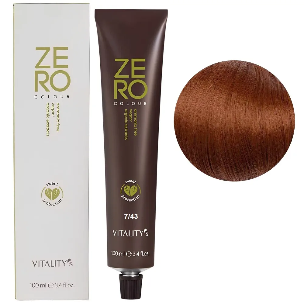 Zero Colour – це веганська фарба з високим натуральним індексом, зі зниженим ризиком подразнення та алергії. Завдяки антиоксидантним та пом`якшувальним властивостям, вона допомагає захистити колір та робить волосся м`яким і шовковистим. Формула без аміаку делікатно відновлює волосся для багатогранного, насиченого та сяючого кольору. Здатна задовольнити бажання кольору всіх жінок, навіть тих, хто має проблеми з чутливістю шкіри. Результат зберігається до 6 тижнів. Зменшуються подразнення та сухість шкіри голови, покращується загальний стан волосся після фарбування. Особливості продукту: 7/43 блондин мідно-золотистий Крем-фарба для волосся без аміаку, 100 мл ZERO VEGAN Vitality`s Застосування: 7/43 блондин мідно-золотистий Крем-фарба для волосся без аміаку, 100 мл ZERO VEGAN Vitality`s Важливо! Продукт для професійного застосування. Уважно ознайомтесь з інструкцією..Крем-фарба для волосся без аміаку ZERO VEGAN Vitality`s
