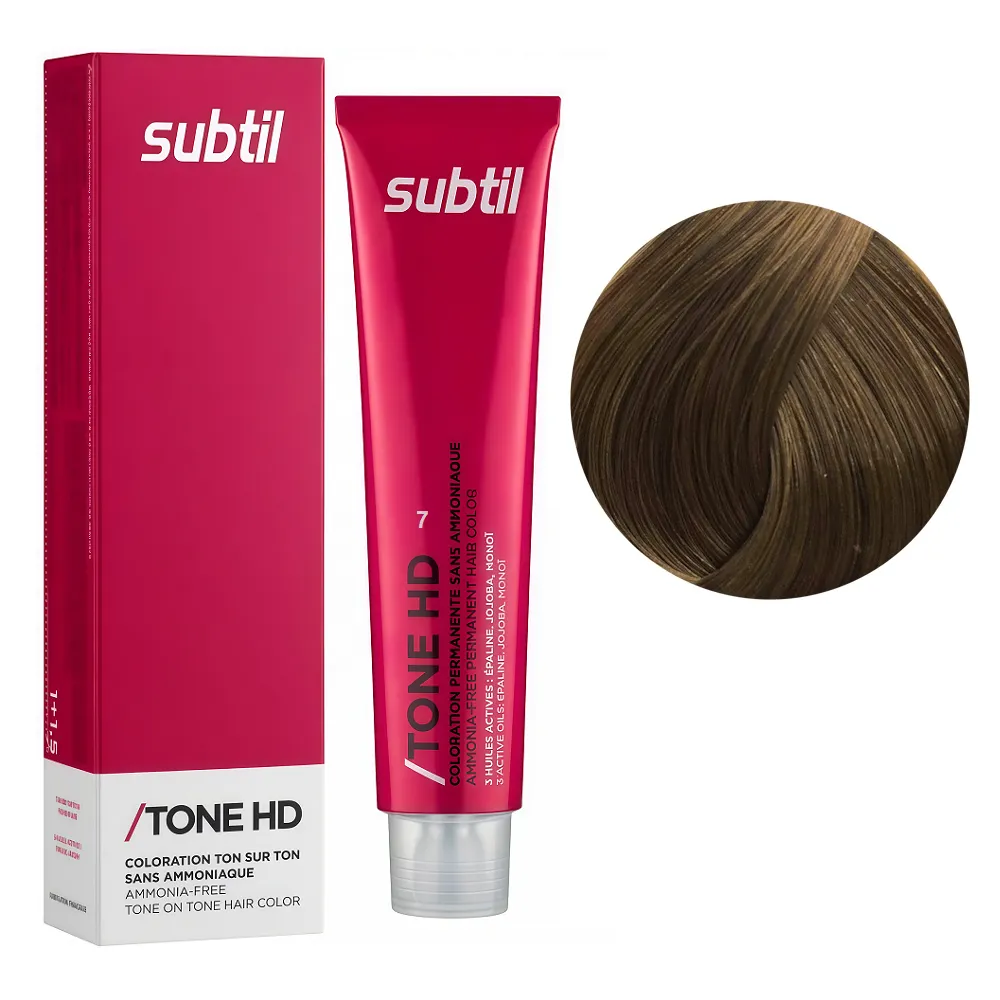 Тонувальна крем-фарба TONE HD має легку консистенцію, що відрізняється м`яким, делікатним впливом на волосся і шкіру голови. Tone HD дозволяє зробити рефреш кольору та підсилення власного тону волосся. Фарба підходить для підтримки необхідного кольору відразу після фарбування, після проведення хімічної завивки, для створення тимчасового відтінку або для фарбування тон-в-тон. В результаті фарбування волосся набуває досконалого вигляду, інтенсивниого яскравого кольору та ідеального блиску. Особливості продукту: 7 блонд Безаміачна крем-фарба для тонування волосся на лужній основі, 60 мл TONE HD SUBTIL Застосування: 7 блонд Безаміачна крем-фарба для тонування волосся на лужній основі, 60 мл TONE HD SUBTIL/span> Розвести в неметалевій ємності: 1 частина Subtil Tone HD + 1,5 частини Subtil OXI 2.7%. Наносимо на сухе, немите волосся. Змиваються безаммиачні фарби поступово, легко, рівномірно, через 4-6 тижнів при митті 2 рази в тиждень, завдяки цьому волосся, що відростає не відрізняється від вже забарвленого. Застосовувати фарбу слід, суворо дотримуючись інструкції, яка додається до кожної упаковки.Безаміачна крем-фарба для тонування волосся на лужній основі TONE HD SUBTIL