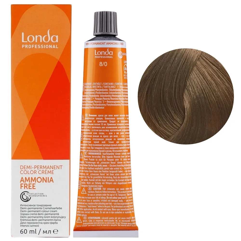 Фарба для інтенсивного тонування без аміаку зі світловідбивними мікросферами Vitaflection створює живе, сяюче волосся з багатовимірним блиском. Demi-Permanent використовує середовище для підлужнення без аміаку та пероксиди низької концентрації, тому прекурсори барвників проникають у волокна волосся менш глибоко. Завдяки цьому структура волосся змінюється менше, ніж при використанні стійких крем-фарб Permanent Color. Особливості продукту: 8/0 світлий блондин Демі-перманентна фарба без аміаку, 60 мл Demi-Permanent Color Londa Professional Застосування: 8/0 світлий блондин Демі-перманентна фарба без аміаку, 60 мл Demi-Permanent Color Londa Professional Змішати Demi-Permanent Color з емульсією для інтенсивного тонування Demi-Permanent Emulsion Londacolor 1,9% або 4%, в пропорції 1:2. Час витримки залежить від бажаного результату. Важливо! Продукт для професійного застосування. Уважно ознайомтесь з інструкцією.Демі-перманентна фарба без аміаку Demi-Permanent Color Londa Professional