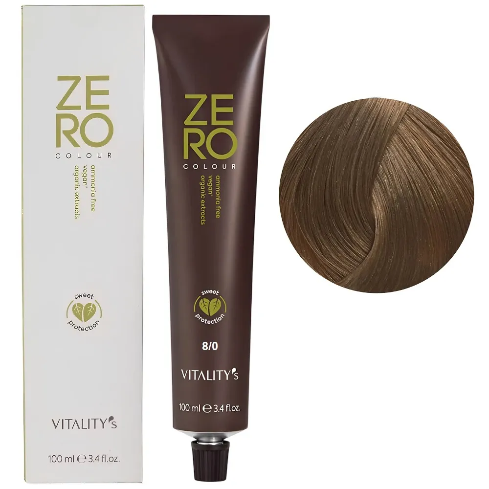 Zero Colour – це веганська фарба з високим натуральним індексом, зі зниженим ризиком подразнення та алергії. Завдяки антиоксидантним та пом`якшувальним властивостям, вона допомагає захистити колір та робить волосся м`яким і шовковистим. Формула без аміаку делікатно відновлює волосся для багатогранного, насиченого та сяючого кольору. Здатна задовольнити бажання кольору всіх жінок, навіть тих, хто має проблеми з чутливістю шкіри. Результат зберігається до 6 тижнів. Зменшуються подразнення та сухість шкіри голови, покращується загальний стан волосся після фарбування. Особливості продукту: 8/0 світлий блондин натуральний Крем-фарба для волосся без аміаку, 100 мл ZERO VEGAN Vitality`s Застосування: 8/0 світлий блондин натуральний Крем-фарба для волосся без аміаку, 100 мл ZERO VEGAN Vitality`s Важливо! Продукт для професійного застосування. Уважно ознайомтесь з інструкцією..Крем-фарба для волосся без аміаку ZERO VEGAN Vitality`s