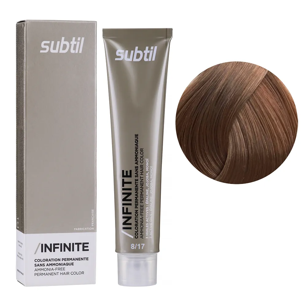 Subtil Infinite - фарба без вмісту аміаку нового покоління, що містить щонайменше 78% інгредієнтів природного походження та трилогію дорогоцінних олій: жожоба, моної, кукурудзяної. Забезпечує 100% зафарбовування сивини, супер блиск та супер стійкість. Безаміачна фарба додає волоссю стійкий і насичений колір, при цьому не ушкоджує і не висушує його. Олії, що входять до складу зволожують і ущільнюють волосся, роблять його блискучим і шовковистим. Щадна формула підходить навіть власницям чутливої шкіри голови. Так само фарба здатна освітлити волосся до трьох рівнів, що є революцією в світі безаміачних фарб. Розкішний колір, гладкість і здоровий блиск без шкоди для волосся. Застосування: 8/17 світлий блондин попелястий каштановий Безаміачна стійка крем-фарба для волосся, 60 мл Permanent Hair Color INFINITE SUBTIL Крем-фарбу потрібно наносити на брудне сухе волосся. Фарбу слід змивати ретельно до повної прозорості води. Час витримки: 8/17 світлий блондин попелястий каштановий Безаміачна стійка крем-фарба для волосся, 60 мл Permanent Hair Color INFINITE SUBTIL Витримати на волоссі від 30 до 35 хвилин, при наявності сивого волосся час впливу можна збільшити на 10 хвилин. Застосовувати фарбу слід, суворо дотримуючись інструкції, яка додається до кожної упаковки.Безаміачна стійка крем-фарба для волосся Permanent Hair Color INFINITE SUBTIL