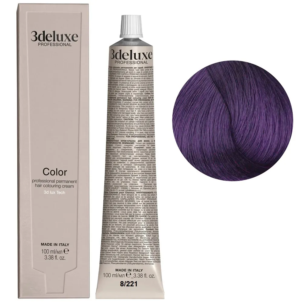 Професійна стійка кремова фарба для волосся Permanent Hair Color 3deluxe з неймовірним відбиттям світла та чудовим захистом, забезпечує волоссю неперевершену якість. Містить технологію 3D Lux, яка забезпечує насичений, яскравий, багатогранний колір: Особливості продукту: 8/221 світлий блондин інтенсивний фіолетовий Фарба для волосся, 100 мл Permanent Hair Color 3Deluxe Professional Активні компоненти: 8/221 світлий блондин інтенсивний фіолетовий Фарба для волосся, 100 мл Permanent Hair Color 3Deluxe Professional Застосування: 8/221 світлий блондин інтенсивний фіолетовий Фарба для волосся, 100 мл Permanent Hair Color 3Deluxe Professional Змішайте в пластмасовому посуді крему-фарбу Color 3deluxe з кремом-окислювачем 1,5%, 3%, 6%, 9% або 12%. Пропорції змішування: для основної палітри відтінків - 1:1,5, для освітлювального ряду - 1:2, для більш насиченого кольору - 1:1. Час витримки залежить від бажаного результату. Важливо! Продукт для професійного застосування. Уважно ознайомтесь з інструкцією.Фарба для волосся Permanent Hair Color 3deluxe Professional