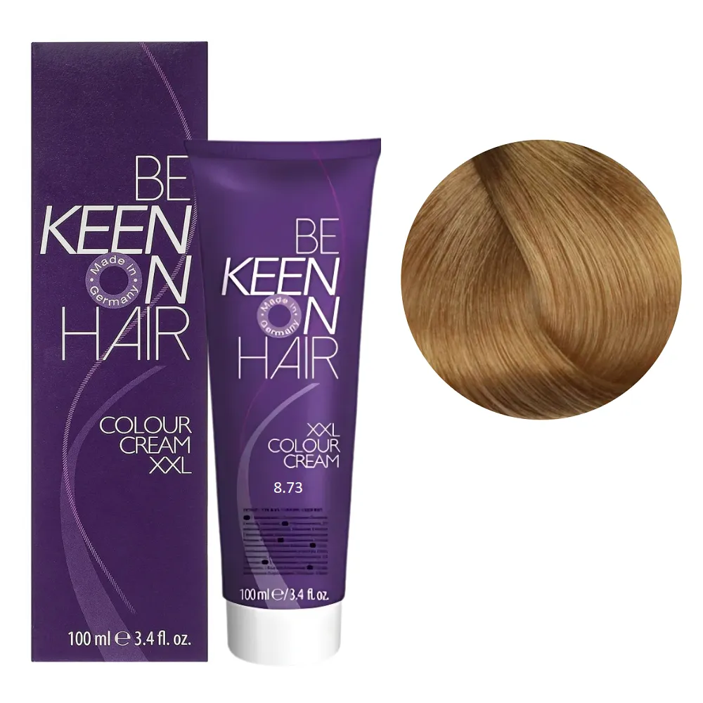 Краще співвідношення ціни та якості! Colour Cream XXL KEEN фарба німецького виробника завоювала визнання професійних майстрів і покупців по всій Європі. Палітра налічує понад 116 відтінків для креативної комбінації кольорів. Всі тони поєднуються між собою, їх можна змішувати, створюючи свій неповторний стиль. Кремоподібна текстура фарби легко наноситься, не тече і забезпечує рівномірний результат. Особливості продукту: 8/73 світлий блондин каштаново-золотистий Стійка крем-фарба для волосся, 100 мл Colour Cream XXL KEEN Активні компоненти: гідролізовані молочні протеїни піклуються про волосся під час фарбування зберігають необхідну вологість, надає волоссю блиску та пружності. Застосування: 8/73 світлий блондин каштаново-золотистий Стійка крем-фарба для волосся, 100 мл Colour Cream XXL KEEN Змішати в неметалевому посуді крем-фарбу Colour Cream XXL KEEN із крем-окислювачем. Фарбуючу суміш наносити на сухе чисте волосся. Вибір концентрації крем-окислювача 1,9%, 3%, 6%, 9% або 12% залежить від бажаного рівня освітлення. При використанні додаткового джерела тепла час витримки зменшується вдвічі. Пропорції змішування: 8/73 світлий блондин каштаново-золотистий Стійка крем-фарба для волосся, 100 мл Colour Cream XXL KEEN Час витримки: 35 хвилин. Продукт призначений для професійного використання. Уважно ознайомтесь з інструкцією.Стійка крем-фарба для волосся Colour Cream XXL KEEN