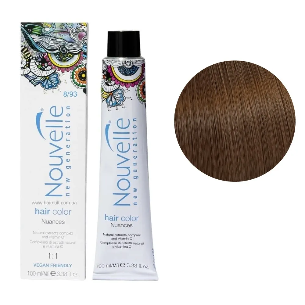 Nouvelle New Generation Hair Color - це стійка аміачна крем-фарба для волосся, яка забезпечує насичений, тривалий колір і професійний результат. Продукт пропонує широку палітру, що включає натуральні, яскраві, модні та ультрасвітлі тони. Особливості продукту: 8/93 світлий пісочно-золотистий блондин Фарба для волосся перманентна, 100мл Permanent Hair Color Nouvelle Застосування: 8/93 світлий пісочно-золотистий блондин Фарба для волосся перманентна, 100мл Permanent Hair Color Nouvelle Фарбу змішують із окислювачем Nouvelle Developer Cream Peroxide (1,5%, 3%, 6%, 9% або 12%) у відповідних пропорціях залежно від бажаного ефекту: тонування, освітлення чи зафарбовування сивини. Суміш наноситься на сухе, немите волосся із витримкою 25-50 хвилин, залежно від інтенсивності кольору. Після фарбування рекомендується використовувати шампунь і доглядові засоби з серії Nouvelle Color Glow для збереження кольору і здоров’я волосся.Фарба для волосся перманентна Permanent Hair Color Nouvelle