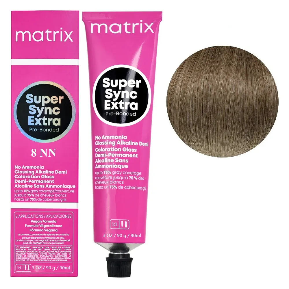 SUPER SYNC EXTRA Pre-Bonded від MATRIX - це інноваційний тонувальний засіб без аміаку, створений для м’якого фарбування та догляду за волоссям. Формула з технологією Pre-Bonded зміцнює внутрішні зв’язки волосини, мінімізує пошкодження та зберігає еластичність навіть після інтенсивних процедур. Продукт забезпечує рівномірне тонування з природним блискомта дарує волоссю доглянутий вигляд. SUPER SYNC EXTRA зафарбовує до 75% сивини. Завдяки відсутності аміаку фарба діє делікатно, не пересушує волосся та підходить навіть для тонкого й ослабленого типу. Результат зберігається до 20 циклів миття голови, поступово та рівномірно вимиваючись без різких переходів. Особливості продукту: 8NN Світлий блондин ннатуральний інтенсивний Тонер на лужній основі 90мл SoColor SYNC EXTRA Pre-Bonded MATRIX Застосування: 8NN Світлий блондин ннатуральний інтенсивний Тонер на лужній основі 90мл SoColor SYNC EXTRA Pre-Bonded MATRIX Пропорції змішування 1:1 з проявником Matrix Cream Developer 3% (10 Volume). Нанесення на чисте волосся. Час витримки - 20 хвилин при кімнатній температурі. Змити водою. Перед застосуванням уважно ознайомтесь з інструкцією! Для професійного використання!Тонер для волосся на лужній основі без аміаку для фарбування сивини SUPER SYNC EXTRA Pre-Bonded MATRIX