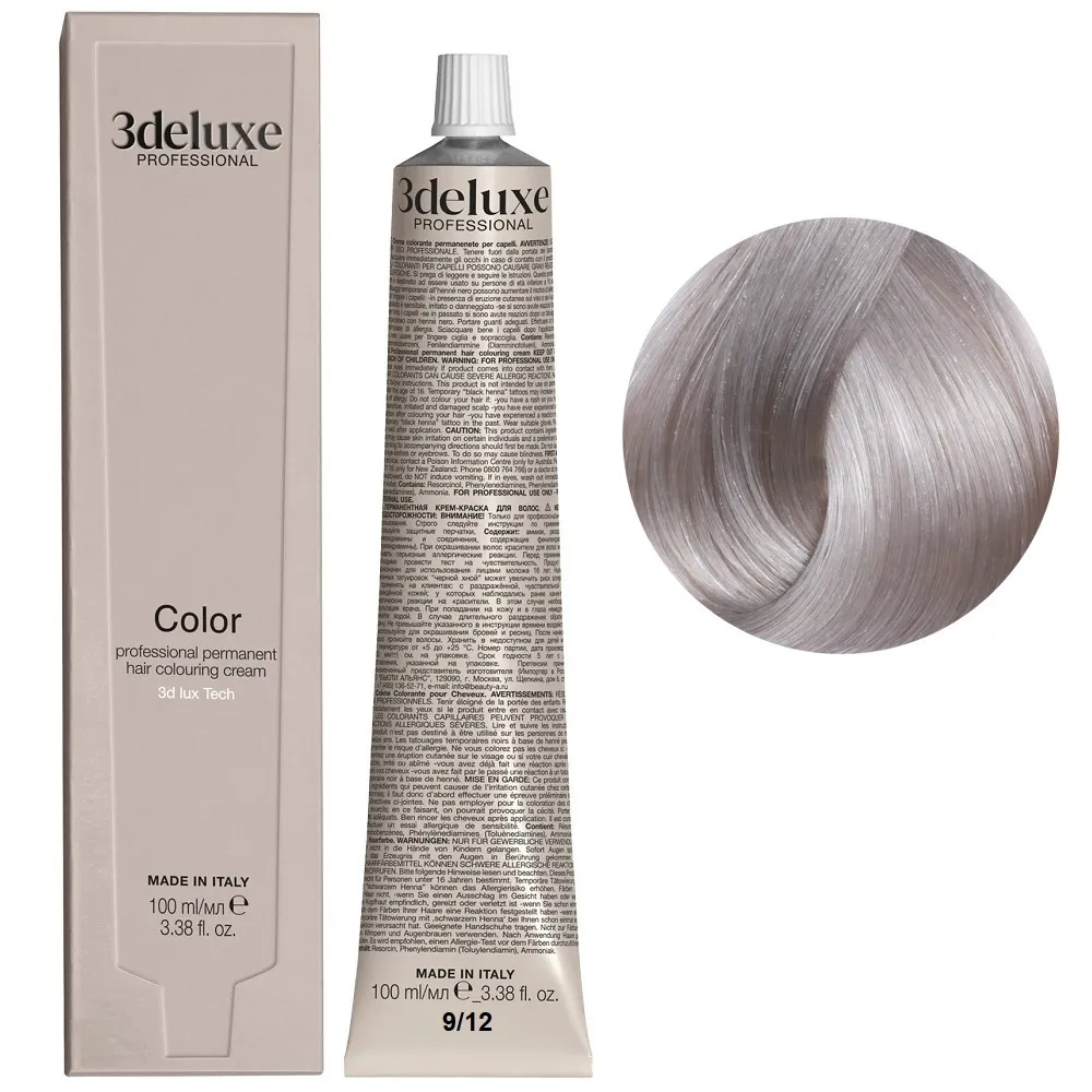 Професійна стійка кремова фарба для волосся Permanent Hair Color 3deluxe з неймовірним відбиттям світла та чудовим захистом, забезпечує волоссю неперевершену якість. Містить технологію 3D Lux, яка забезпечує насичений, яскравий, багатогранний колір: Особливості продукту: 9/12 дуже світлий блондин попелясто-переливчастий Фарба для волосся, 100 мл Permanent Hair Color 3Deluxe Professional Активні компоненти: 9/12 дуже світлий блондин попелясто-переливчастий Фарба для волосся, 100 мл Permanent Hair Color 3Deluxe Professional Застосування: 9/12 дуже світлий блондин попелясто-переливчастий Фарба для волосся, 100 мл Permanent Hair Color 3Deluxe Professional Змішайте в пластмасовому посуді крему-фарбу Color 3deluxe з кремом-окислювачем 1,5%, 3%, 6%, 9% або 12%. Пропорції змішування: для основної палітри відтінків - 1:1,5, для освітлювального ряду - 1:2, для більш насиченого кольору - 1:1. Час витримки залежить від бажаного результату. Важливо! Продукт для професійного застосування. Уважно ознайомтесь з інструкцією.Фарба для волосся Permanent Hair Color 3deluxe Professional