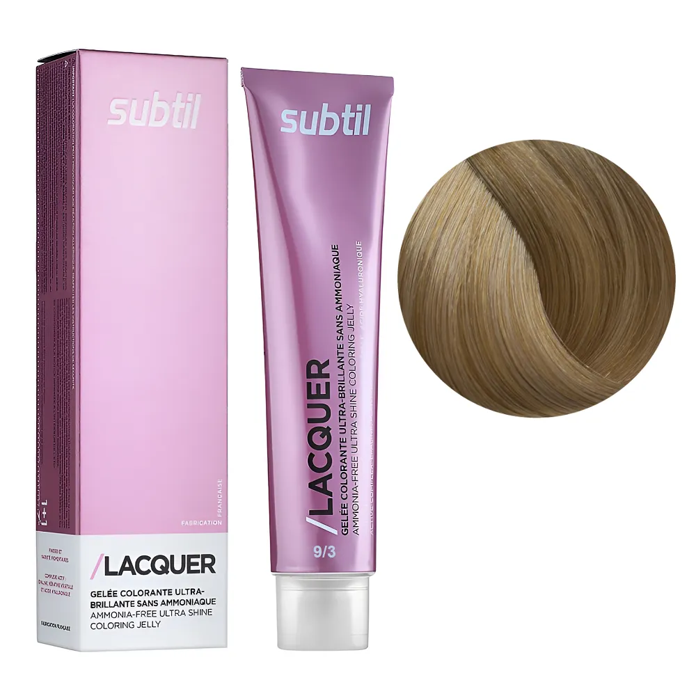 Subtil Lacquer - це фарба для волосся, створена без використання аміаку, на основі гілауроновой кислоти, рослинного кератину і EPOLINE - запатентованої формули (кукурудзяна олія + кисень). З цією фарбою тепер ви можете забути про процедуру відновлення кератину - фарбування і насичення волосся кератином відбувається одночасно і всього за 20 хвилин. Формула Lacquer містить також компоненти, що захищають шкіру, це робить фарбу доступною для застосування при дуже чутливій шкірі голови. Особливості продукту: 9/3 дуже світлий блондин золотистий Безаміачна тонувальна гелева фарба на кислотній основі, 60 мл LACQUER SUBTIL Застосування: 9/3 дуже світлий блондин золотистий Безаміачна тонувальна гелева фарба на кислотній основі, 60 мл LACQUER SUBTIL Час витримки: 9/3 дуже світлий блондин золотистий Безаміачна тонувальна гелева фарба на кислотній основі, 60 мл LACQUER SUBTIL Витримати на волоссі 20 хвилин після нанесення на коріння. Застосовувати фарбу слід, суворо дотримуючись інструкції, яка додається до кожної упаковки.Безаміачна тонувальна гелева фарба на кислотній основі LACQUER SUBTIL