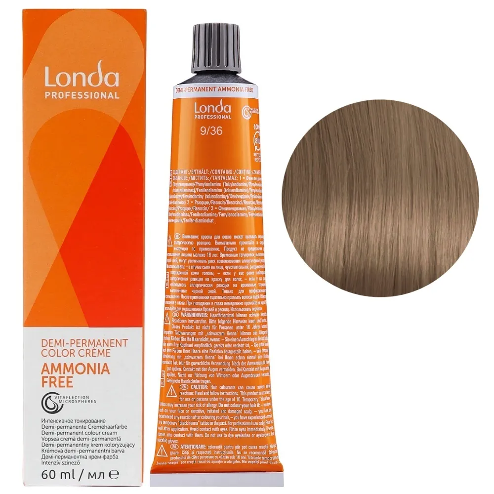 Фарба для інтенсивного тонування без аміаку зі світловідбивними мікросферами Vitaflection створює живе, сяюче волосся з багатовимірним блиском. Demi-Permanent використовує середовище для підлужнення без аміаку та пероксиди низької концентрації, тому прекурсори барвників проникають у волокна волосся менш глибоко. Завдяки цьому структура волосся змінюється менше, ніж при використанні стійких крем-фарб Permanent Color. Особливості продукту: 9/36 дуже світлий блондин золотисто-фіолетовий Демі-перманентна фарба без аміаку, 60 мл Demi-Permanent Color Londa Professional Застосування: 9/36 дуже світлий блондин золотисто-фіолетовий Демі-перманентна фарба без аміаку, 60 мл Demi-Permanent Color Londa Professional Змішати Demi-Permanent Color з емульсією для інтенсивного тонування Demi-Permanent Emulsion Londacolor 1,9% або 4%, в пропорції 1:2. Час витримки залежить від бажаного результату. Важливо! Продукт для професійного застосування. Уважно ознайомтесь з інструкцією.Демі-перманентна фарба без аміаку Demi-Permanent Color Londa Professional