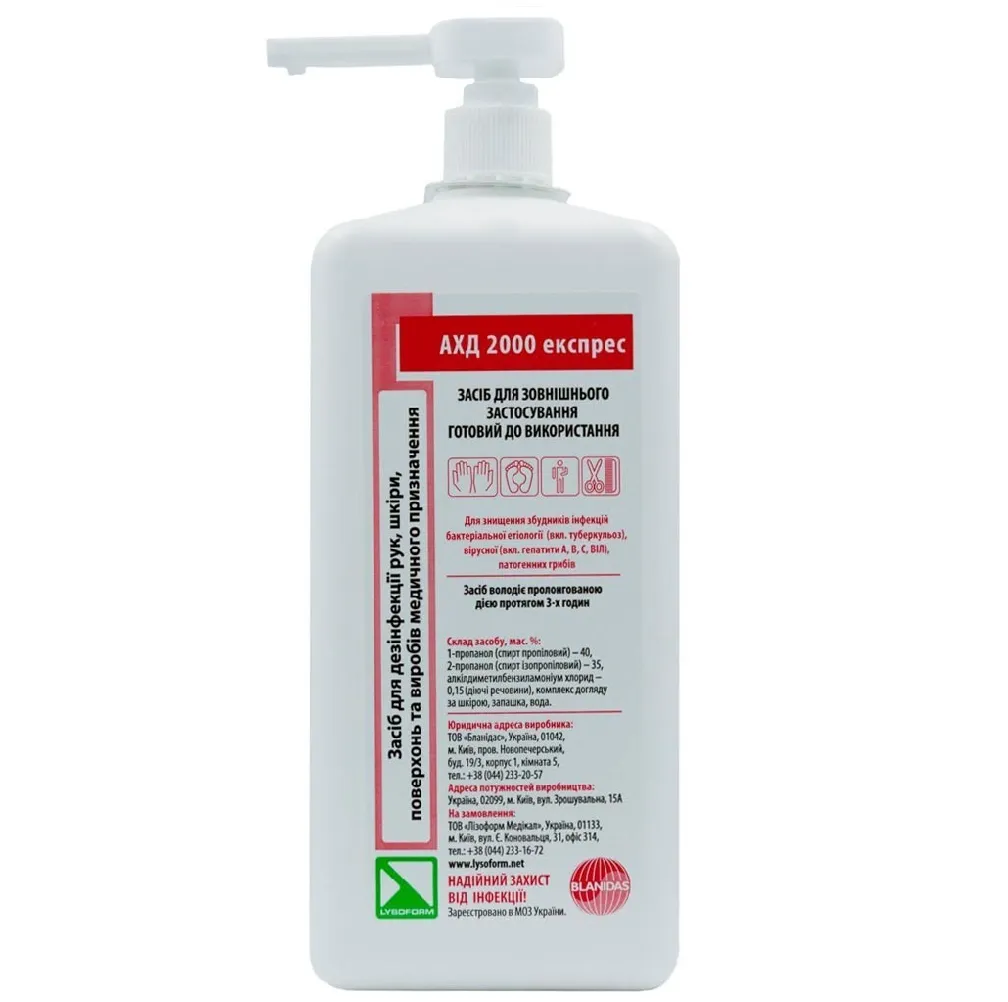Опис Властивості: Сфера застосування: Рекомендується використовувати цей засіб для дезінфекції рук медичного персоналу в закладах охорони здоров’я, ліктьовихЗасіб для дезінфекції АХД 2000