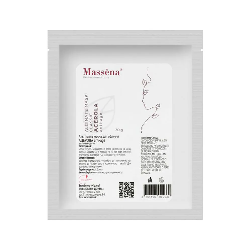 Ацерола ACEROLA anti-age, альгінатна маска – це інноваційний продукт, спеціально розроблений для боротьби зі старінням шкіри. Завдяки екстракту ацероли, маска ефективно освітлює, зміцнює судинні стінки, підтримує пружність шкіри та запобігає утворенню пігментних плям. Підходить для застосування у програмах з корекції овалу обличчя. Особливості продукту: Альгінатна маска для обличчя (САШЕ) anti-age "Ацерола", 30 г ACEROLA Classic Alginate Mask Massena Активні компоненти: Альгінатна маска для обличчя (САШЕ) anti-age "Ацерола", 30 г ACEROLA Classic Alginate Mask Massena Застосування: Альгінатна маска для обличчя (САШЕ) anti-age "Ацерола", 30 г ACEROLA Classic Alginate Mask MassenaАльгінатна маска для обличчя anti-age "Ацерола" ACEROLA Classic Alginate Mask Massena