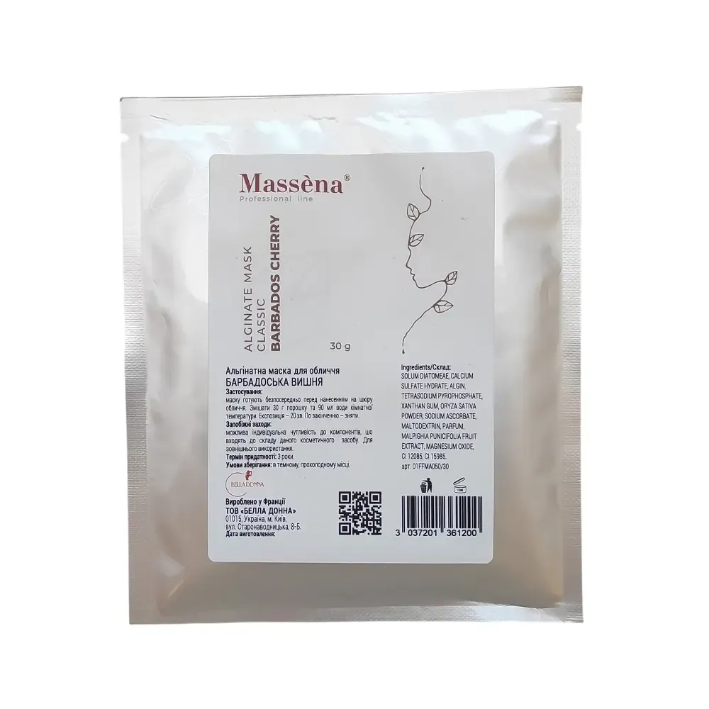 Барбадоська вишня BARBADOS CHERRY альгінатна маска для обличчя - це професійний засіб для комплексного догляду за шкірою, який дарує їй молодість, сяйво та здоровий вигляд. Маска містить високий вміст екстракту ацероли (Барбадоської вишні), що насичує шкіру вітаміном C, стимулює регенерацію, підвищує еластичність і забезпечує захист від шкідливих впливів довкілля: Ідеально підходить для догляду за віковою, куперозною та пігментованою шкірою, а також для шкіри зі зниженим тургором. Особливості продукту: Альгінатна маска для обличчя (САШЕ) "Барбадоська вишня", 30 г BARBBADOS CHERRY Classic Alginate Mask Massena Активні компоненти: Альгінатна маска для обличчя (САШЕ) "Барбадоська вишня", 30 г BARBBADOS CHERRY Classic Alginate Mask Massena екстракт ацероли містить калій, магній, кальцій, фосфор, пантотенову кислоту, що сприяє швидкому відновленню та регенерації клітин шкіри обличчя. Застосування: Альгінатна маска для обличчя (САШЕ) "Барбадоська вишня", 30 г BARBBADOS CHERRY Classic Alginate Mask MassenaАльгінатна маска для обличчя "Барбадоська вишня" BARBBADOS CHERRY Classic Alginate Mask Massena