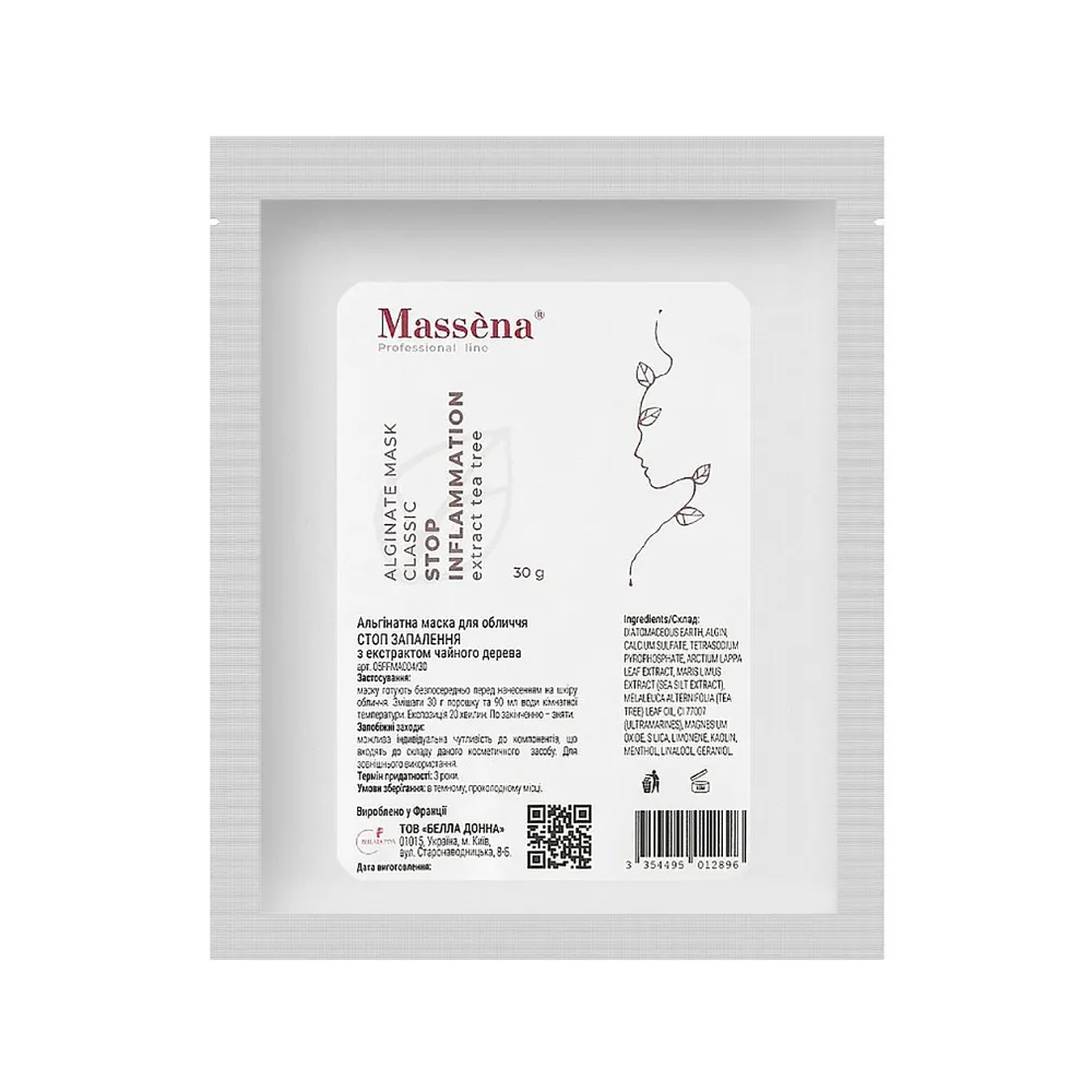 Стоп запалення STOP INFLAMMATION альгінатна маска – це професійне рішення для власників жирної та проблемної шкіри. Завдяки екстракту чайного дерева, вона забезпечує себорегулюючу, протизапальну та антибактеріальну дію, що дозволяє ефективно боротися із запаленнями та висипаннями. Маска допомагає глибоко очищати пори, усуває забруднення, регулює виділення шкірного сала, а також освіжає шкіру та зменшує почервоніння та набряклість. Особливості продукту: Альгінатна маска для обличчя (САШЕ) з екстрактом чайного дерева "Стоп запалення", 30 г STOP INFLAMMATION Classic Alginate Mask Massena Активні компоненти: Альгінатна маска для обличчя (САШЕ) з екстрактом чайного дерева "Стоп запалення", 30 г STOP INFLAMMATION Classic Alginate Mask Massena Застосування: Альгінатна маска для обличчя (САШЕ) з екстрактом чайного дерева "Стоп запалення", 30 г STOP INFLAMMATION Classic Alginate Mask MassenaАльгінатна маска для обличчя з екстрактом чайного дерева "Стоп запалення" STOP INFLAMMATION Classic Alginate Mask Massena