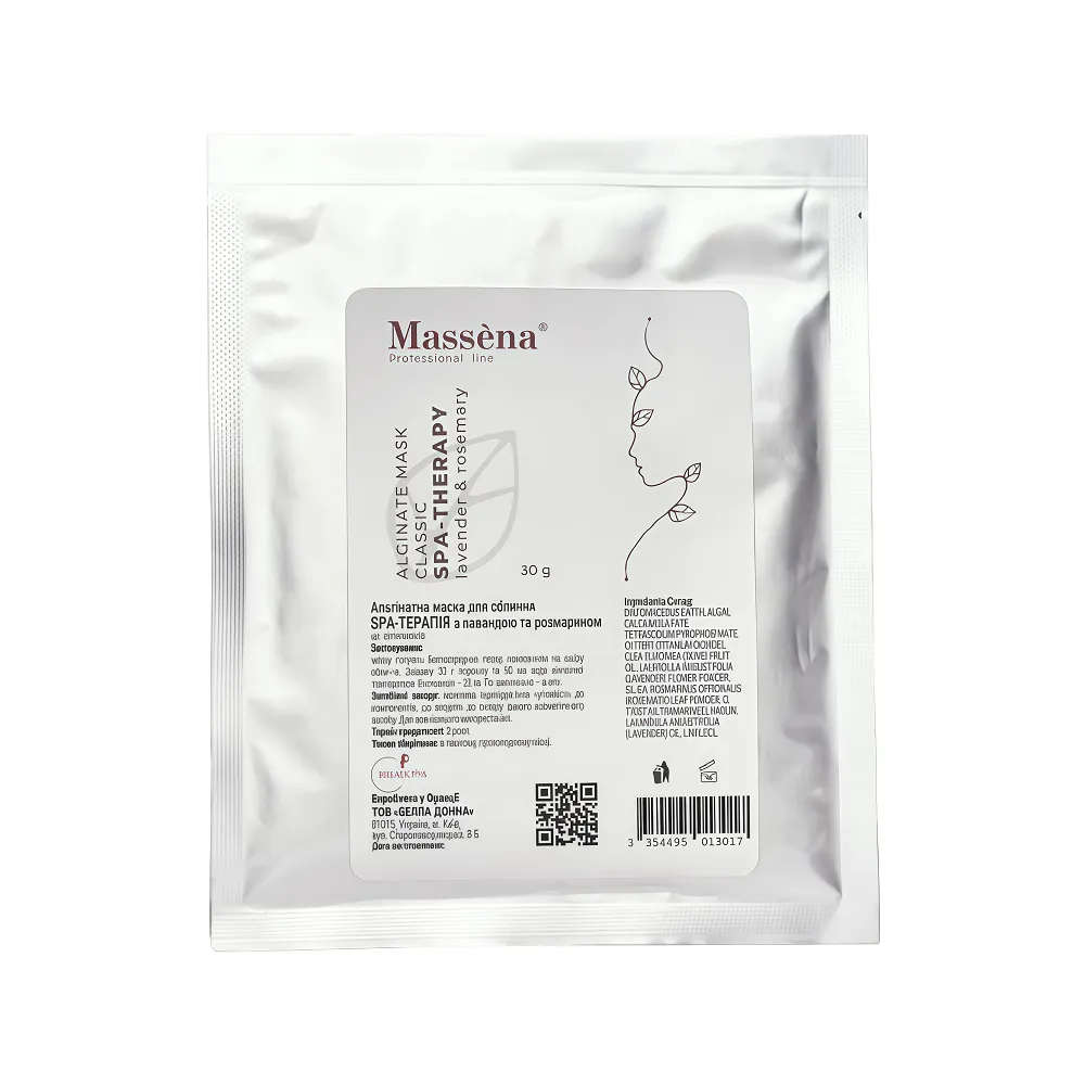 Спа-терапія SPA-THERAPY з лавандою та розмарином, альгінатна маска – це розкішний догляд, який поєднує косметичні та релаксаційні властивості. Призначена для вирівнювання тону шкіри, зняття почервоніння та боротьби з ознаками старіння. Ця маска стане вашим надійним помічником у домашніх СПА-процедурах. Її унікальна формула з активними інгредієнтами забезпечує шкірі свіжість, пружність та природне сяйво. Особливості продукту: Альгінатна маска для обличчя (САШЕ) з лавандою та розмарином "Спа-терапія", 30 г SPA-THERAPY Classic Alginate Mask Massena Активні компоненти: Альгінатна маска для обличчя (САШЕ) з лавандою та розмарином "Спа-терапія", 30 г SPA-THERAPY Classic Alginate Mask Massena Застосування: Альгінатна маска для обличчя (САШЕ) з лавандою та розмарином "Спа-терапія", 30 г SPA-THERAPY Classic Alginate Mask MassenaАльгінатна маска для обличчя з лавандою та розмарином "Спа-терапія" SPA-THERAPY Classic Alginate Mask Massena