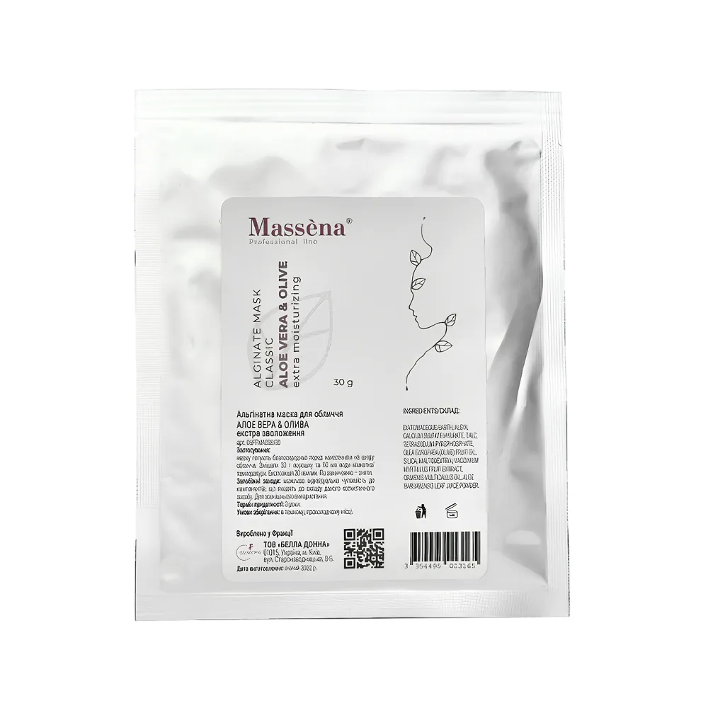 Алое та олією оливи ALOE VERA & OLIVE зволожувальна альгінатна маска – це справжній рятівник для сухої, подразненої та зневодненої шкіри. Спеціально розроблена формула поєднує в собі цілющі властивості алое, яке заспокоює і відновлює шкіру, та олії оливи, що глибоко живить і зволожує. Маска допомагає покращити пружність шкіри, зняти набряки та стимулювати метаболічні процеси, дарує обличчю здорове сяйво та рівний тон. Ідеально підходить для сухої та подразненої шкіри. Особливості продукту: Альгінатна маска для обличчя (САШЕ) зволожувальна з "Алое та олією оливи", 30 г ALOE VERA & OLIVE Classic Alginate Mask Massena Активні компоненти: Альгінатна маска для обличчя (САШЕ) зволожувальна з "Алое та олією оливи", 30 г ALOE VERA & OLIVE Classic Alginate Mask Massena Застосування: Альгінатна маска для обличчя (САШЕ) зволожувальна з "Алое та олією оливи", 30 г ALOE VERA & OLIVE Classic Alginate Mask MassenaАльгінатна маска для обличчя зволожувальна з "Алое та олією оливи" ALOE VERA & OLIVE Classic Alginate Mask Massena