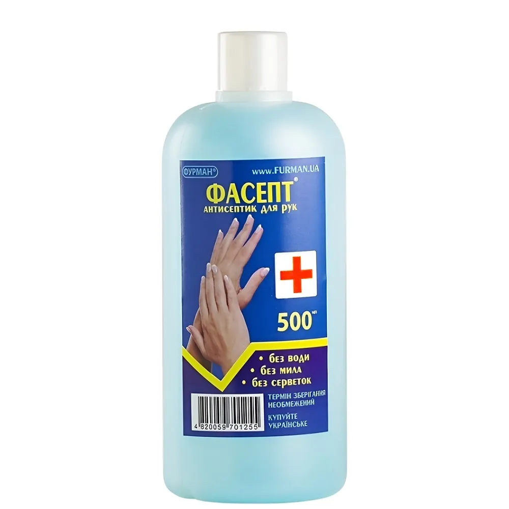 Антисептик для рук Фурман Фасепт - ефективний засіб для швидкої та надійної дезінфекції шкіри рук. Забезпечує широкий спектр антимікробної дії: активно знищує стафілококи, стрептококи, грамнегативні бактерії (зокрема кишкову та синьогнійну паличку), анаеробні бактерії, грибки та інактивує віруси. Засіб має високу швидкість дії, добре проникає в пори шкіри та забезпечує як бактерицидний, так і бактеріостатичний ефект. Знищує до 99% шкідливих мікроорганізмів, залишає шкіру чистою та захищеною. Застосування: Антисептик для рук "ФАСЕПТ", 500 мл ФУРМАН Нанести на шкіру і ретельно втирати 30 сек.Антисептик для рук "ФАСЕПТ" ФУРМАН