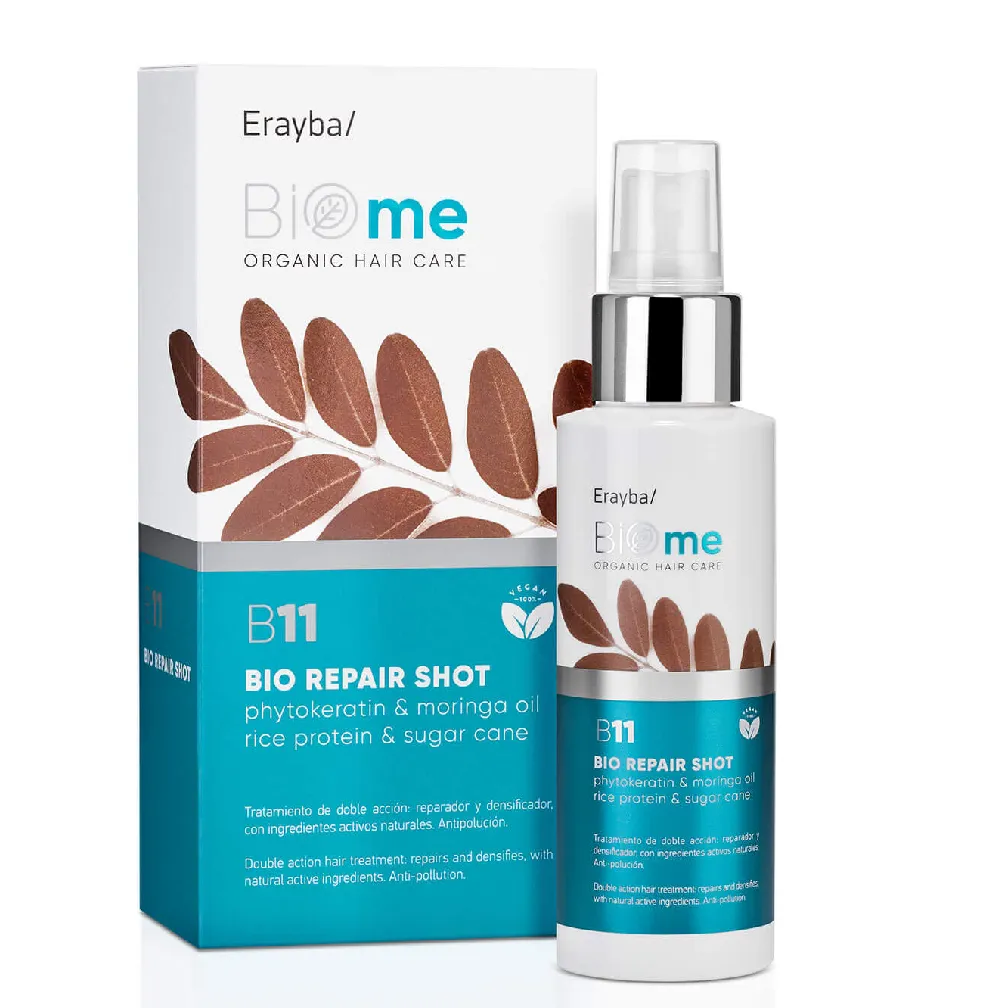 Органічна сироватка для волосся Bio Repair Shot Lotion B11 інтенсивно зволожує та живить волосся. Сироватка підходить для всіх типів волосся, але особливо ефективна по відношенню до сухого, ламкого пасма, що вимагає додаткового догляду. Його активні інгредієнти насичують корисними мінералами і надають локонам чудовий блиск. Засіб зміцнює, захищає від пошкоджень, пом`якшує волосся. Активні компоненти: фітокератин, олія морінги, протеїн рису, цукрова тростина. Особливості продукту: Застосування: розпиліть на вологе волосся від коренів до кінчиків і розчешіть. Не змивати.Біолосьон для інтенсивного зволоження та живлення волосся незмивний з фітокератином Bio Repair Shot Lotion B11 BIOme ERAYBA