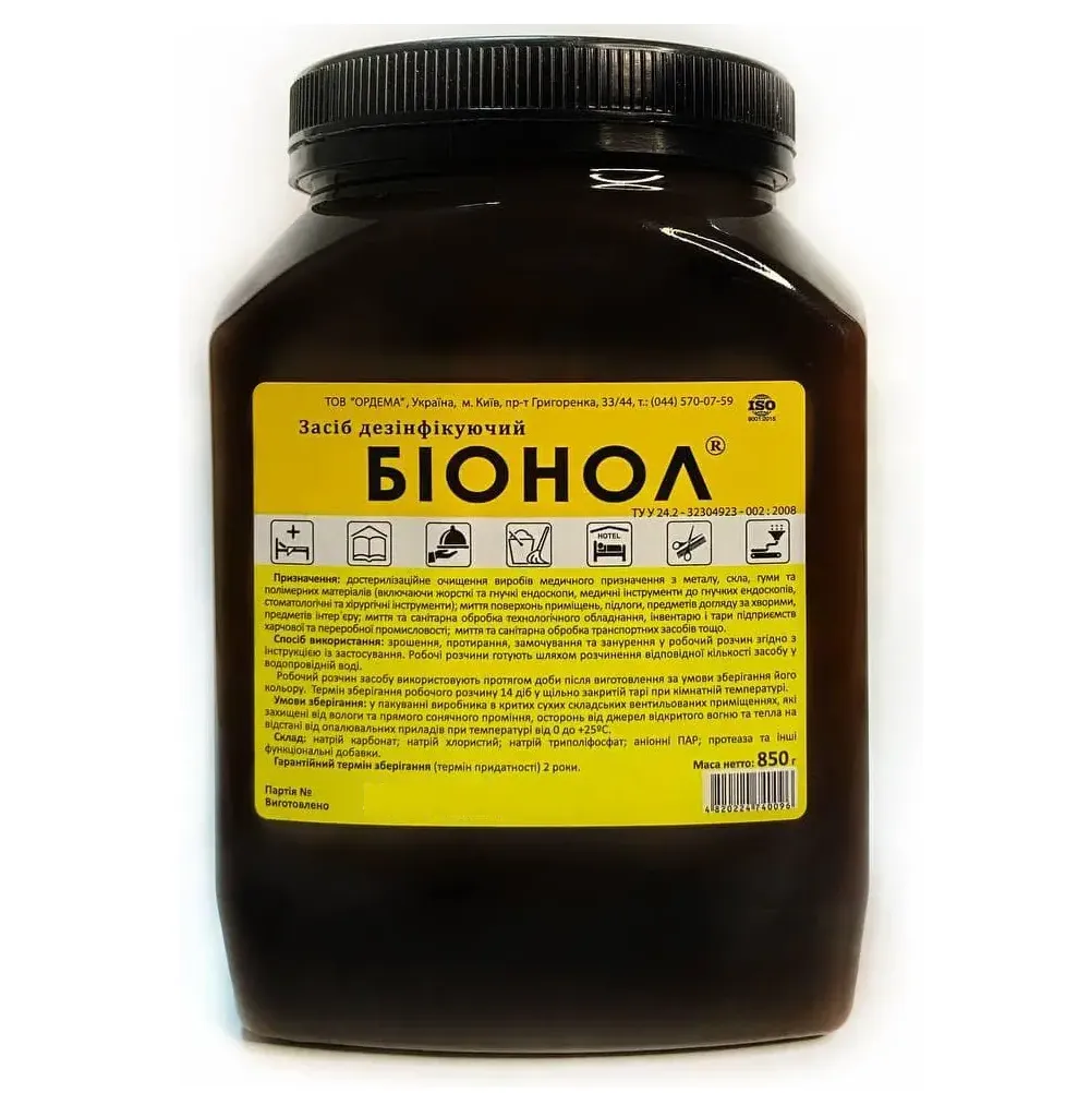 Ефективний порошкоподібний миючий засіб на основі ПАР, ензимів та ін. високоякісних добавок. Властивості: Призначення засобу: Використання: Дозволяється зберігати невикористаний робочий розчин протягом 14 діб за умови зберігання в тарі із щільно закритою кришкою. Біонол миючий дезінфікуючий засіб