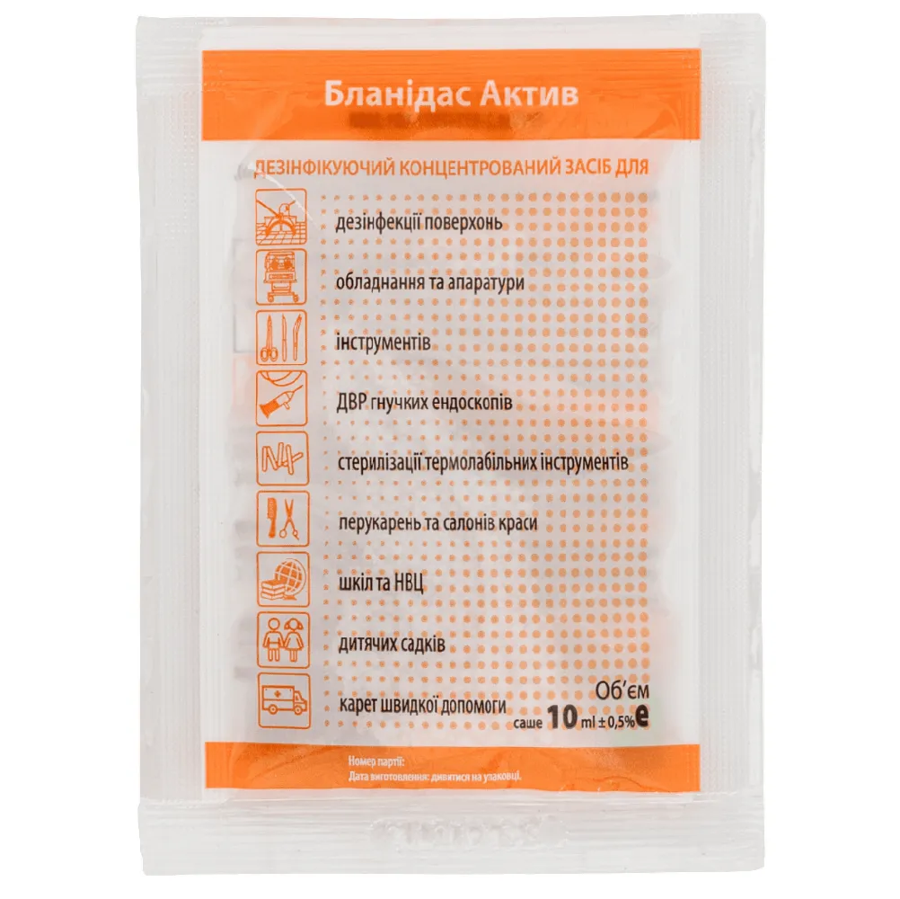 Опис Властивості: Рекомендації щодо застосування Дезінфекція та очищення всіх типів поверхонь у приміщеннях, медичних пристроїв та обладнання, посуду, інвентарю тощо. в Умови зберігання Склад: третинні аміни, ЧАСКонцентрат - Бланідас Актив