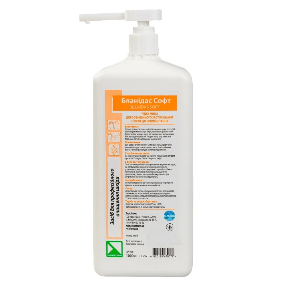 Опис: Властивості: Сфера застосування: Гігієнічне миття рук в усіх галузях медицини, домашніх умовах, галузях комунально-побутового обслуговування тощо. Гігієнічне Спосіб використання: Склад: лауретсульфат натрію, кокамідопропілбетаїн, діетаноламіди жирних кислот кокосової олії, хлорид натрію, гліцерин,Бланідас Софт