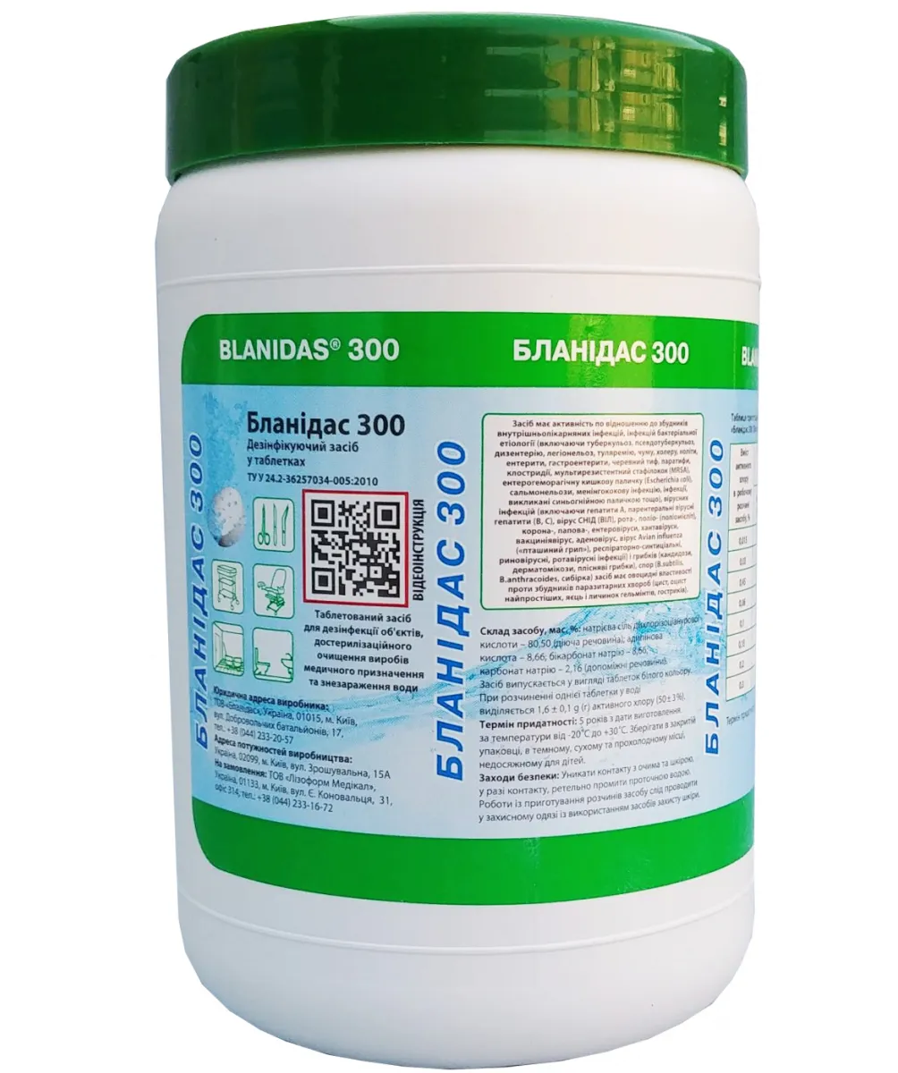 Бланідас 300 (таблетки) від відомого українського виробника «Бланідас» – універсальний засіб для дезінфекції на основі хлору. Таблетки для дезінфекції Бланідас 300 (таблетки) ефективні проти широкого спектру потенційно небезпечних мікроорганізмів, Крім того, засіб має яскраво вираженими миючими властивостями. Воно швидко і без особливих зусиль очищає поверхні від Засобом зручно користуватися. Щоб приготувати робочий розчин, буде потрібно не більше пари хвилин: таблетки легко і швидко Цей таблетований антисептик дуже економічний: з 1 банки на 300 таблеток можна приготувати 3000 л розчину. При цьомуБланідас - таблетки для дезинфекції (300 шт)