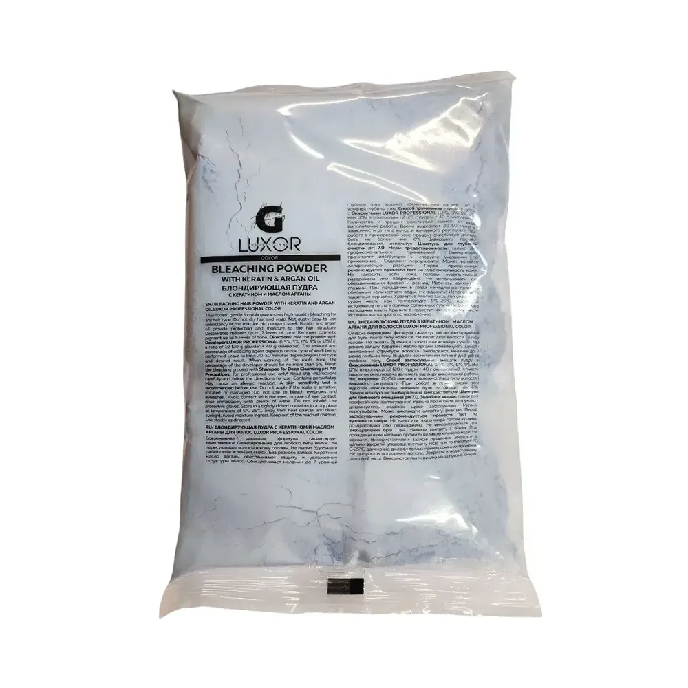 Пудра блондувальна Color BLEACHING POWDER створена фахівцями Luxor Professional для волосся будь-якого типу. Засіб з кератином і олією аргани забезпечує найбільш щадний вплив на пасма, дозволяє досягти бажаного результату, не побоюючись висушення стоншення волосся, подразнення шкіри голови. Пудра з дрібнодисперсною текстурою проста у застосуванні. Вона не утворює пил, легко поєднується з окислювачем, при цьому забезпечує комфортну для нанесення консистенцію. Суміш не має дратівливого запаху, рівномірно обволікає пасма. Формула пудри збагачена олією аргани і кератином, завдяки яким волосся зберігає необхідну вологу, залишається після освітлення еластичними, гладкими і сяючими. Особливості продукту: Блондувальна пудра (блакитна) з кератином і аргановою олією (7 levels), 500 г BLEACHING POWDER with keratin & argan oil LUXOR Professional Застосування: Блондувальна пудра (блакитна) з кератином і аргановою олією (7 levels), 500 г BLEACHING POWDER with keratin & argan oil LUXOR Professional Пропорція змішування 1:2 із крем-окислювачем на 1,5%, 3%, 6%. При використанні 9% та 12% слід працювати з обережністю. Важливо! Продукт для професійного використання. Уважно ознайомтесь з інструкцією.Блондувальна пудра (блакитна) з кератином і аргановою олією (7 levels) BLEACHING POWDER with keratin & argan oil LUXOR Professional