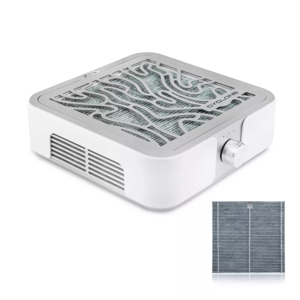 Витяжка для манікюру Bucos CYCLONE X2 Silver з HEPA фільтром забезпечує надійний захист майстра і клієнта, ефективно захоплюючи пил під час обпилювання, випаровування та дрібні частинки матеріалів при виконанні різних нейл-процедур. Її стильний і мінімалістичний дизайн ідеально підійде для використання як у салонах краси, так і вдома у початківців майстрів. З потужністю 72 Вт, витяжка працює так само ефективно, як і 100-ватні моделі, забезпечуючи чистоту робочого простору. Тришаровий вугільний HEPA фільтр нового покоління ефективно уловлює частинки різних розмірів, запобігаючи їх повторному викиду. Формований шар активованого вугілля утримує та нейтралізує більшість шкідливих речовин і запахів, що виникають під час спилювання гель-лаків. Компактна та тонка настільна витяжка Bucos CYCLONE X2 Silver (висота — 7,5 см) легко поміщається під манікюрну підставку. Пристрій має три рівні потужності, включаючи турборежим, які регулюються плавним обертанням регулятора на бічній панелі. Про зміну потужності інформують три зелені індикатори, що відповідають обраному режиму. Корпус витяжки виготовлений із міцного ударостійкого пластику, а прогумовані ніжки запобігають ковзанню на робочій поверхні. На бічній панелі є USB-роз`єм для підключення лампи, фрезера або зарядки телефону. Модель сертифікована в Україні та має офіційну гарантію на 12 місяців. Її універсальний сріблястий колір і стриманий дизайн роблять витяжку доречною в будь-якому інтер`єрі.Витяжка для манікюру настільна з HEPA фільтром Bucos CYCLONE X2 Silver — особливості: