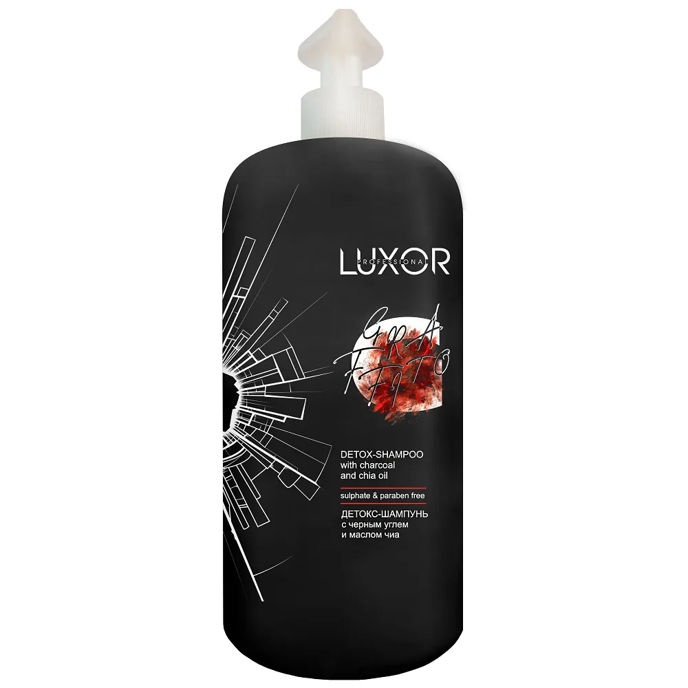 Безсульфатний шампунь Detox-Shampoo на м`якій миючій основі для глибокого та делікатного очищення. Активоване вугілля як природний адсорбент глибоко очищує волосся та шкіру голови від надлишків себуму, токсинів та забруднення від навколишнього середовища. Іони цинку та міді активізують захисну функцію шкіри, стимулюють вироблення кератину, колагену та еластину, покращуючи зовнішній вигляд волосся. Мають заспокійливі та протизапальні властивості, регулюють роботу сальних залоз. Олія чі відновлює пошкоджені ділянки волосся, інтенсивно зволожує і надає діамантовий блиск волоссю. Особливості продукту: Активні компоненти: активоване вугілля, іони цинку та міді, олія чіа. Застосування: невелику кількість шампуню нанести на вологе волосся, розподілити по довжині, спінити масажними рухами. Змити великою кількістю води. За необхідності використовувати повторно.Детокс-шампунь безсульфатний з чорним вугіллям і маслом чіа, 1000 мл Detox-Shampoo Sulfate & Paraben Free LUXOR Professional