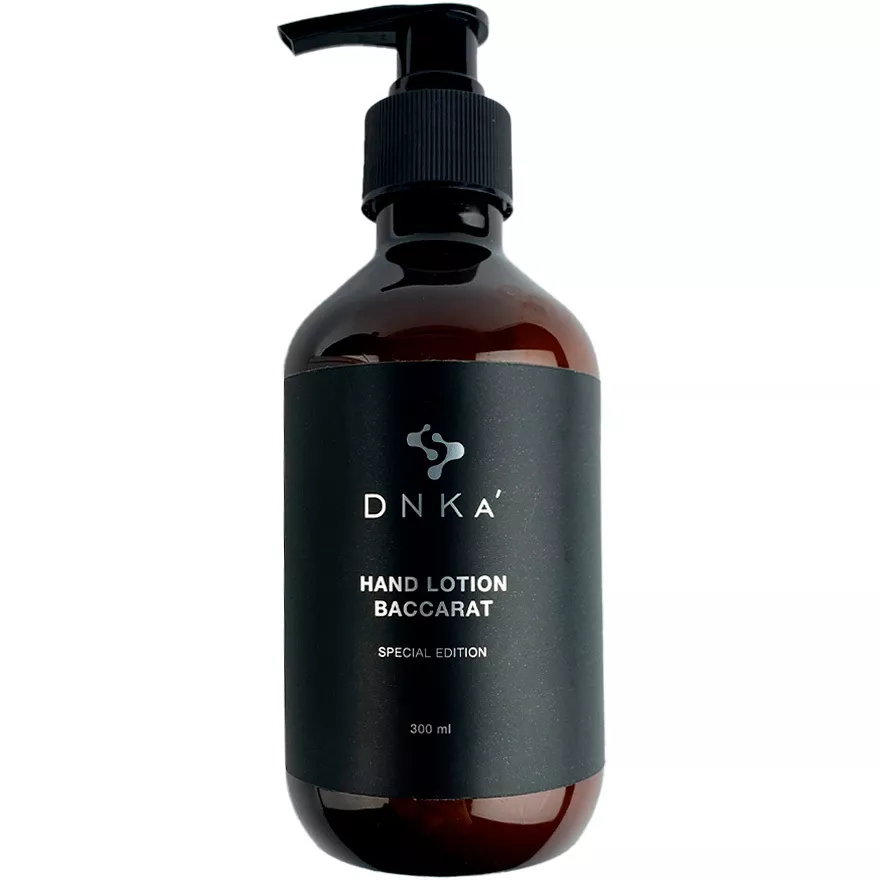 DNKa’ Hand Lotion - лінійка парфумованих лосьйонів для рук. Це преміальний продукт для догляду за шкірою, що поєднує в собі властивості інтенсивного зволоження та приємного люксового аромату. Завдяки унікальній формулі, він швидко поглинається, роблячи руки оксамитово м`якими. Аромат Baccarat – починається свіжими нотами жасмину та додатковою глибиною шафрану, виражаючи ніжні відтінки, які поступово розкривають свою чуттєвість в серці, наповненому теплим амбровим відтінком.