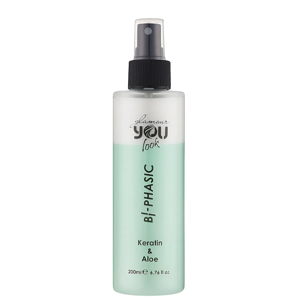 Спрей Keratin & Aloe BI-PHASIC це засіб, який завдяки кератину та екстракту алое ефективно розплутує волосся та забезпечує глибоке зволоження. Особливості продукту: Двофазний спрей-кондиціонер для всіх типів волосся, 200 мл Keratin & Aloe BI-PHASIC Glamour You look Professional Застосування: Двофазний спрей-кондиціонер для всіх типів волосся, 200 мл Keratin & Aloe BI-PHASIC Glamour You look Professional Необхідно змішати дві фази, струсивши флакон, розпилити на вологе або сухе волосся з відстані не менше 20см. Розчесати для рівномірного розподілу продукту по волоссю, приступити до укладання. Не змивати.Двофазний спрей-кондиціонер для всіх типів волосся Keratin & Aloe BI-PHASIC Glamour You look Professional