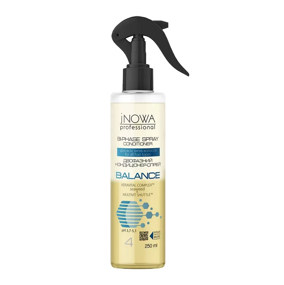 BALANCE JNOWA Professional - серія професійної продукції для всіх типів волосся. КОНДИЦІОНЕР-СПРЕЙ ДЛЯ ВСІХ ТИПІВ ВОЛОССЯ BALANCE KeraVital COMPLEX – інноваційний комплекс, спеціально розроблений Інститутом Здорового Волосся ACME MultivitShutle – інноваційна збалансована система доставки комбінації з вітамінів та зволожувачів на стрижень волосини. Містить Екстракт водоростей, збагачений мікро- та макроелементи, які: