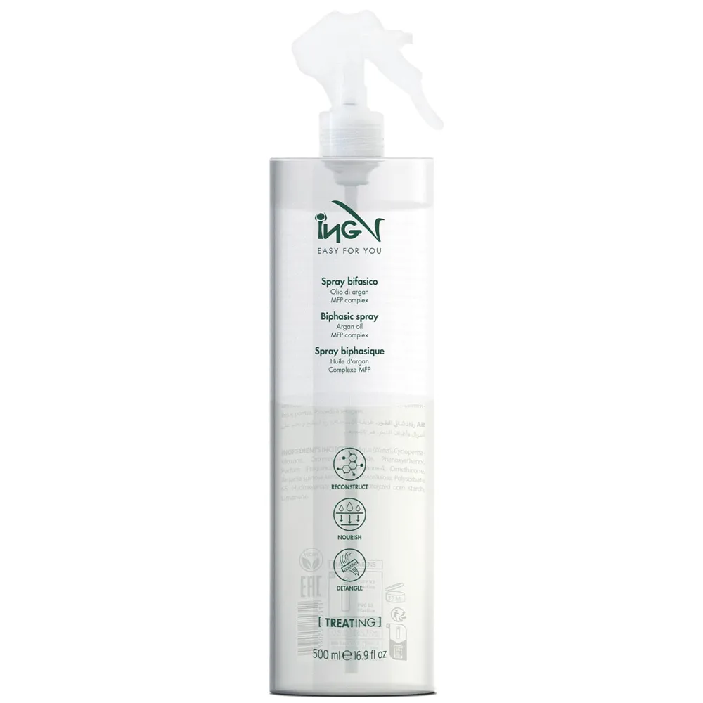 Двофазний спрей для волосся Biphasic spray Treating подарує легке розчісування, живлення, зволоження, природне сяйво, антистатичний ефект. Все це в одному продукті, який ідеально підходить для сухого та пошкодженого волосся, гарантуючи миттєвий результат. Продукт складається з живильної масляної фази вгорі та мінерального водного шару внизу, які надають зволоження та відновлення структури, кутикули та кінчиків. Арганова олія у його формулі забезпечує живлення та зволоження, надаючи волоссю м`якості та блиску. Особливості продукту: Активні компоненти: Застосування: перед застосуванням добре струсити флакон, невелику кількість спрею нанести на вологе волосся. Не змивати. Приступити до укладання.Двофазний спрей зволожувальний з аргановою олією та UV-фільтром Biphasic spray Treating ING Professional