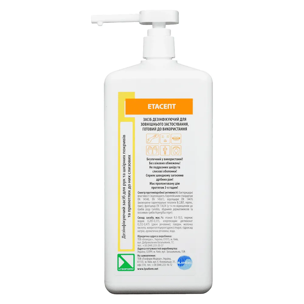 Властивості: Сфера застосування: Призначення: Спосіб використання: Методи нанесення: тампонний; зрошення; промивання; використання серветок. Склад: Етанол – 9,5-10,5 %; перекис водню – 0,285-0,315 %; хлоргексидин диглюконат 0,252-0,475 % (діючі речовини);Етасепт