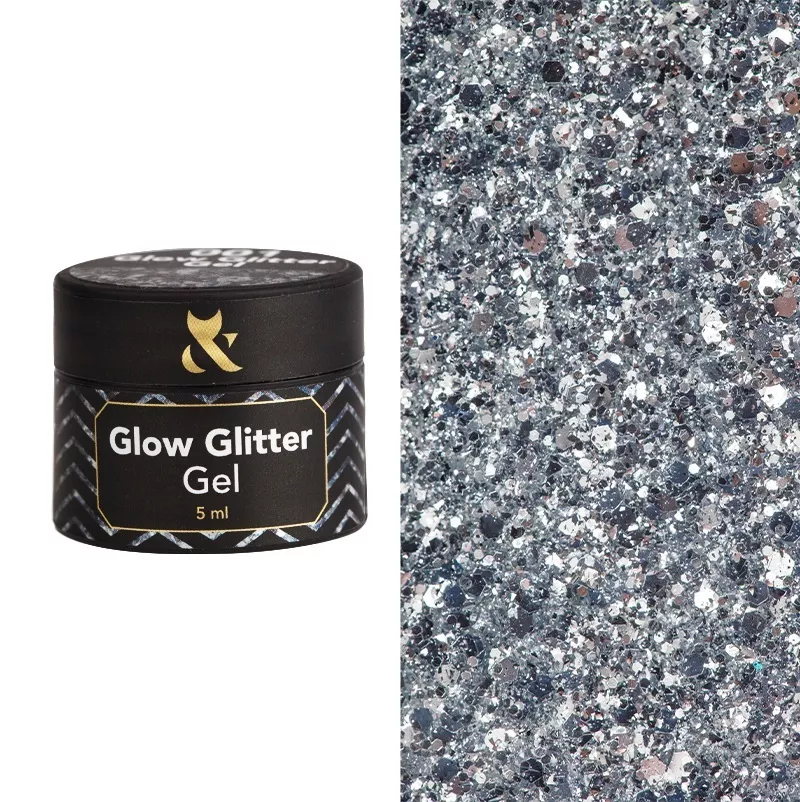 F.O.X Glow Glitter Gel — колекція з 10 щільних гелей для дизайну. Кожен із відтінків унікальний: 001 — чисте срібло без голографічного ефекту. Сяючі блискітки та шестикутники створюють елегантний блиск. Всі відтінки шикарно переливаються у різному освітленні. Гель-лаки дозволяють створити ефектний дизайн, який тільки зможе вигадати nail-майстер. Стандартна підготовка нігтьової пластини 1. На забафлену поверхню нігтя нанести знежирюючий засіб F.O.X Nail Prep; 2. Нанести F.O.X Ultrabond — безкислотний праймер для додаткового зчеплення; 3. Нанести вибрану за типом нігтів базу F.O.X і просушити в UV-лампі 36W – 2 хв., LED/UV-лампі 36/48W – 60 сек. 4. Викласти F.O.X Glow Glitter Gel в 1-2 шари. Сушити в лампі: UV-лампа (36 Вт) — 2 хв., LED-лампа — 60 с.; 5. Покрити будь-яким фінішним покриттям F.O.X і просушути в UV-лампі 36W – 2 хв., LED/UV-лампі 36/48W – 60 сек. 6. Нанести масло для кутикули F.O.X Dry Cuticle Oil Oasis. За бажанням Glow Glitter Gel можна наносити частково для створення дизайну та втілення будь-яких ідей майстра. Переваги :