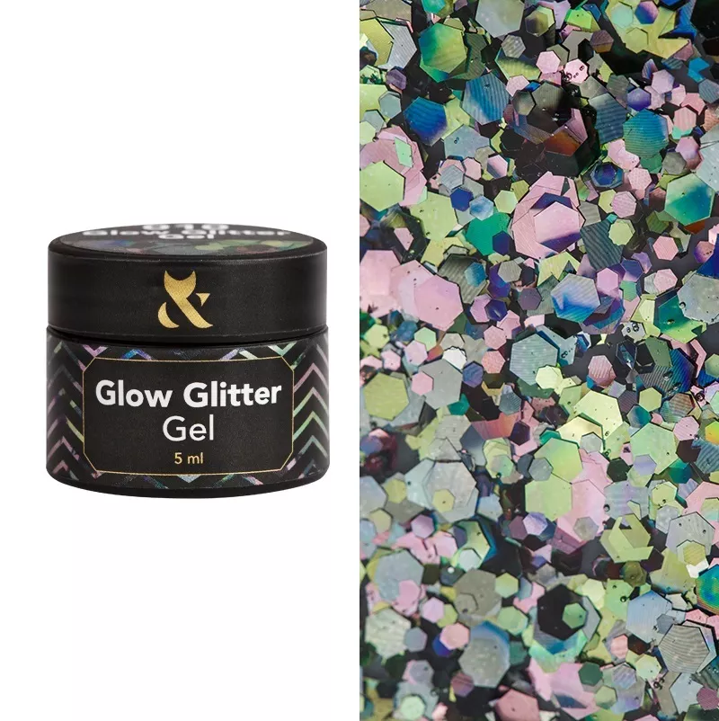 F.O.X Glow Glitter Gel — колекція з 10 щільних гелей для дизайну. Кожен із відтінків унікальний: 010 — зелені, рожеві та голографічні шестикутники-каміфубукі різного розміру. Дзеркальне сяйво, що фантастично переливається всіма можливими кольорами. Всі відтінки шикарно переливаються у різному освітленні. Гель-лаки дозволяють створити ефектний дизайн, який тільки зможе вигадати nail-майстер. Стандартна підготовка нігтьової пластини 1. На забафлену поверхню нігтя нанести знежирюючий засіб F.O.X Nail Prep; 2. Нанести F.O.X Ultrabond — безкислотний праймер для додаткового зчеплення; 3. Нанести вибрану за типом нігтів базу F.O.X і просушити в UV-лампі 36W – 2 хв., LED/UV-лампі 36/48W – 60 сек. 4. Викласти F.O.X Glow Glitter Gel в 1-2 шари. Сушити в лампі: UV-лампа (36 Вт) — 2 хв., LED-лампа — 60 с.; 5. Покрити будь-яким фінішним покриттям F.O.X і просушути в UV-лампі 36W – 2 хв., LED/UV-лампі 36/48W – 60 сек. 6. Нанести масло для кутикули F.O.X Dry Cuticle Oil Oasis. За бажанням Glow Glitter Gel можна наносити частково для створення дизайну та втілення будь-яких ідей майстра. Переваги :
