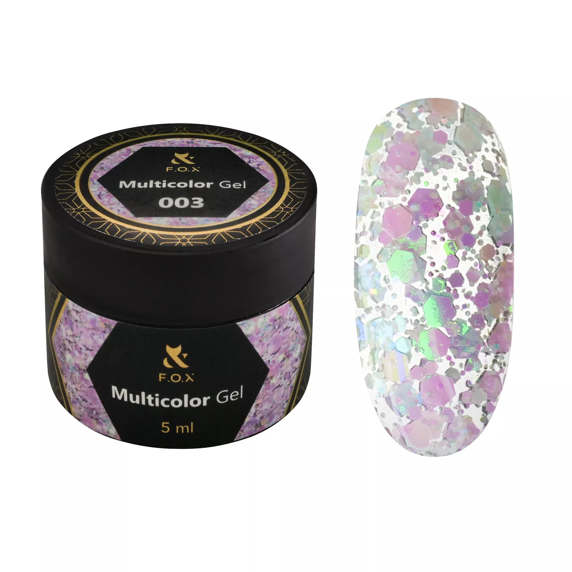 F.O.X Multicolor Gel – це колекція з 4-ох гель-лаків для дизайну. Кожен з відтінків це поєднання кольорових шестигранників, каміфубуків та блискіток різного розміру. Гель-лаки можна наносити окремо, без кольорової «підложки», а також, створювати дизайни в поєднанні з гель-лаками , кольоровими базами або моделюючими гелями від ТМ F.O.X Стандартна підготовка нігтьової пластини 1. На забафлену поверхню нігтя нанести знежирюючий засіб F.O.X Nail Prep; 2. Нанести F.O.X Ultrabond — безкислотний праймер для додаткового зчеплення; 3. Нанести вибрану за типом нігтів базу F.O.X і просушити в UV-лампі 36W – 2 хв., LED/UV-лампі 36/48W – 60 сек. 4. Покриваємо нігтьову пластину одним шаром будь-якого гель-лаку з колекцій F.O.X. Полімеризуємо в UV-лампі 36W – 2 хв., LED/UV-лампі 36/48W – 60 сек. За необхідності повторюємо процедуру (робимо другий шар) 5. Набрати на пензель F.O.X Multicolor Gel 001 та виповнити дизайн. Полімеризувати у LED-лампі (36/48 Вт) — 60 сек.; в UV-лампі (36 Вт) — 1 хв. 6. Повністю перекрити ніготь будь-яким топом від F.O.X на вибір. Просушити його в лампі. Видаляється засобом F.O.X Gel Remover за 10 хв. або за допомогою апарату. Можна наносити замість гелю-лаку для створення напівпрозорого покриття на всю нігтьову пластину. Технологія застосування: