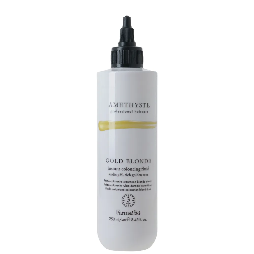 Флюїд Instant Colouring Fluid AMETHYSTE це революція в прямому фарбуванні волосся. Унікальна гелева основа гарантує інтенсивний, сяючий колір, подібний до результатів напівперманентного фарбування, навіть на темних волоссях (окрім відтінків Lilac Frozen та Gold Blonde). Ідеально підходить для маскування перших сивих волосків, тому що має здатність до 40% покривати сивину. Тривалість ефекту - до 8 миттів голови (залежить від базового кольору клієнта, стану волосся та обраного відтінку). Відтінки можна змішувати між собою для створення індивідуальних кольорових рішень. GOLD BLONDE оживляє світле волосся та мелірування, надає інтенсивних золотистих відтінків. Ідеально для відтінків: .03 / .3 / .8 / .31 / .34 Особливості продукту: Фарбувальний флюїд (відтінок: НАСИЧЕНИЙ ЗОЛОТИСТИЙ), 250 мл Instant Colouring Fluid GOLD BLONDE AMETHYSTE FarmaVita Застосування: Фарбувальний флюїд (відтінок: НАСИЧЕНИЙ ЗОЛОТИСТИЙ), 250 мл Instant Colouring Fluid GOLD BLONDE AMETHYSTE FarmaVitaФарбувальний флюїд Instant Colouring Fluid AMETHYSTE FarmaVita