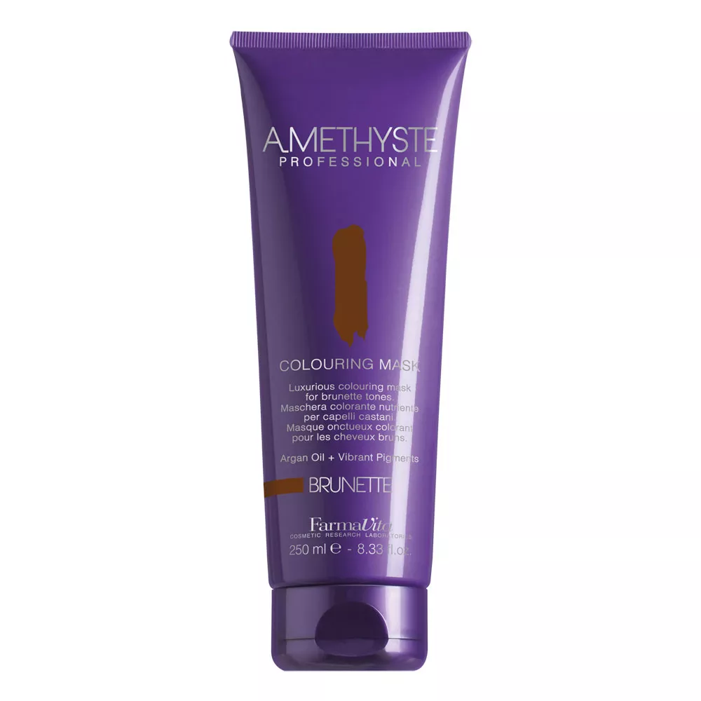Amethyste Colouring Mask BRUNETTE Фарбуюча маска для коричневих відтінків Надає коричневим та шоколадним тонам більш яскравий колір. Живить волосся завдяки олії аргани. Надає неймовірний блиск і м`якість волоссю. після миття голови шампунем Amethyste Color Shampoo, одягніть рукавички на руки, нанесіть маску рівномірно на підсушене рушником волосся. Залиште на 5 хвилин. Після цього ретельно змийте. Застосування: