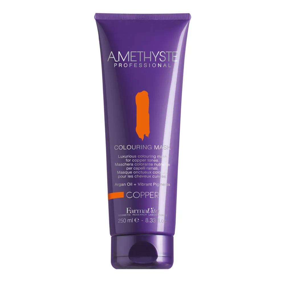 Amethyste Colouring Mask COPPER Фарбуюча маска для мідних відтінків Підсилює і надає мідні і теплі мідні тони. Живить волосся завдяки олії аргани. Надає неймовірний блиск і м`якість волоссю. після миття голови шампунем Amethyste Color Shampoo, одягніть рукавички на руки, нанесіть маску рівномірно на підсушене рушником волосся. Залиште на 5 хвилин. Після цього ретельно змийте. Застосування: