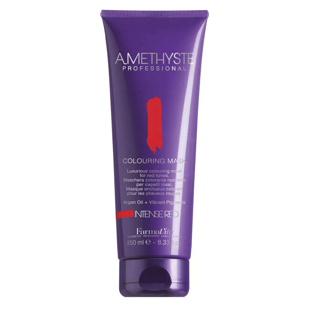 Amethyste Colouring Mask INTENSE RED Фарбуюча маска для червоних відтінків Підсилює і надає світлі і темні червоні тони. Живить волосся завдяки олії аргани. Надає неймовірний блиск і м`якість волоссю. Прибирає залишкову жовтизну після мелірування, надаючи волоссю блискучу білизну. після миття голови шампунем Amethyste Color Shampoo, одягніть рукавички на руки, нанесіть маску рівномірно на підсушене рушником волосся. Залиште на 5 хвилин. Після цього ретельно змийте. Застосування: