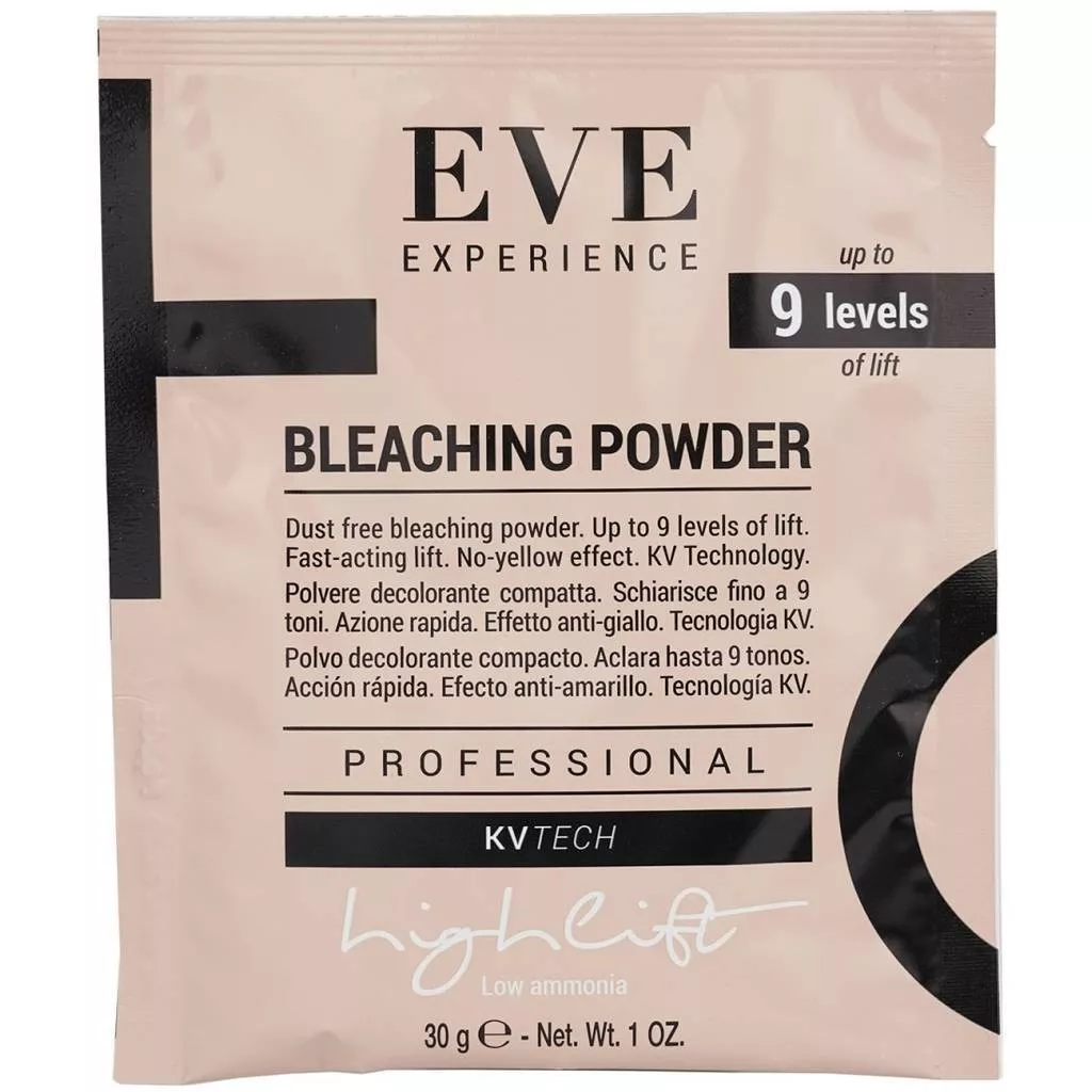 EVE BLEACHING POWDER Синій знебарвлюючий порошок Освітлюючий порошок синього кольору мікрогранульований, з високим ступенем освітлення до 9 рівнів, має приємну отдушку. Покращена текстура, підходить для будь-якої техніки освітлення. Інноваційна формула EVE Bleaching powder здатна утримувати аміак і поступово його вивільняти в процесі освітлення, що дозволяє, досягти високого рівня освітлення з низьким відсотком аміаку, на відміну від інших осветляющих порошків. Продукт не має різкого запаху аміаку і робить сам процес фарбування більш комфортним, як для клієнта, так і для майстра. Збагачений KV Technology, EVE Bleaching powder дозволяє зробити безпечне освітлення, не завдаючи шкоди волоссю. Eve bleaching powder змішується з окислювачем Eve Cream Developer в пропорціях 1: 1 або 1: 2. Співвідношення змішування ви обираєте в залежності від ваших уподобань текстури консистенції і техніки. Співвідношення 1: 1 - забезпечує більш щільну консистенцію. Ідеально підходить для відкритих технік, «вільної техніки» або «техніки вільної руки». Технологи не рекомендують використовувати 9% оислювач і вище, при закритих техніках і на шкірі голови. При нанесенні враховувати структуру і стан волосся. Застосування: