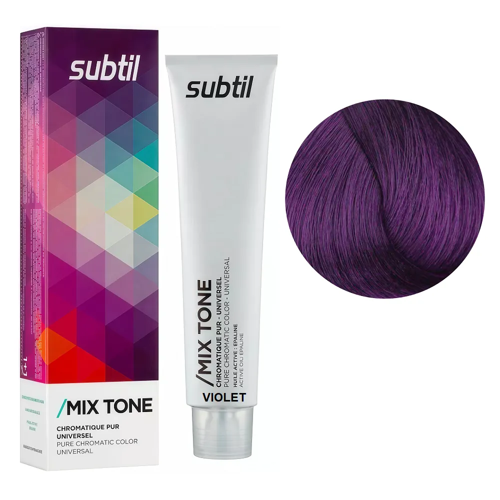Subtil MIX TONE - стійка крем-фарба, концентрат фарбувальних речовин без аміаку, яка надає насичений відтінок, здорове волосся, сяючий блиск та розкішний вигляд! В асортименті MIX TONE вісім основних відтінків (фіолетовий, синій, маджента, жовтий, помаранчевий, перламутровий, зелений, графіт) MIX TONE виконують три основні функції: створення відтінку при прямому фарбуванні, посилення кольору та нейтралізація небажаних відтінків. Рекомендується застосовувати з усіма лінійками барвників SUBTIL Ducastel - тому фарба підходить для універсального використання при всіх техніках фарбування. Покриває волосся спеціальною плівкою, глибоко зволожує їх зсередини і живить структуру волосся, не обтяжує, додає блиск, еластичність, вже після першого використання. Також запобігає посіченість кінчиків і відновлює волосся під час фарбування. Застосування: Фiолетовий (VIOLET) Стійка крем-фарба без аміаку, 60 мл MIX TONE SUBTIL 2. Посилення кольору та нейтралізація небажаних відтінків: MIX TONE використовують в суміші з усіма лініями барвників SUBTIL з окислювачами Subtil Oxidant 3%, 6%, 9%, 12% або 2,7% в пропорції від 1 + 1 до 1 + 3 в залежності від фарбувальної суміші, яка використовується: Застосовувати фарбу слід, суворо дотримуючись інструкції, яка додається до кожної упаковки.Стійка крем-фарба без аміаку MIX TONE SUBTIL