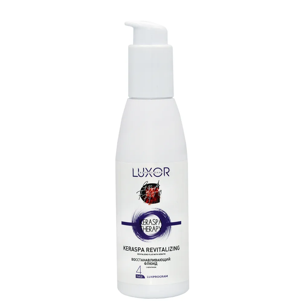 Флюїд KERASPA REVITALIZING для інтенсивного відновлення та реставрації сухого та сильно пошкодженого волосся внаслідок хімічного випрямлення або завивки, фарбування та блондування. Завдяки високій концентрації кератин глибоко проникає у структуру волосся, зміцнює ослаблені сірчані сполуки, посилює пружність, еластичність та щільність волосся. Пантенол максимально зволожує волосся, нормалізує гідробаланс та зберігає косметичний колір. Особливості продукту: Активні компоненти: гідролізований кератин, гіздролізат рисового протеїну, гліцерин, пантенол, олія аргани. Застосування: У процедурі KeraSpa Therapy: Домашній догляд за волоссям:Флюїд відновлювальний термозахисний з кератином (фаза 4) KERASPA REVITALIZING KeraSpa Therapy LUXOR Professional