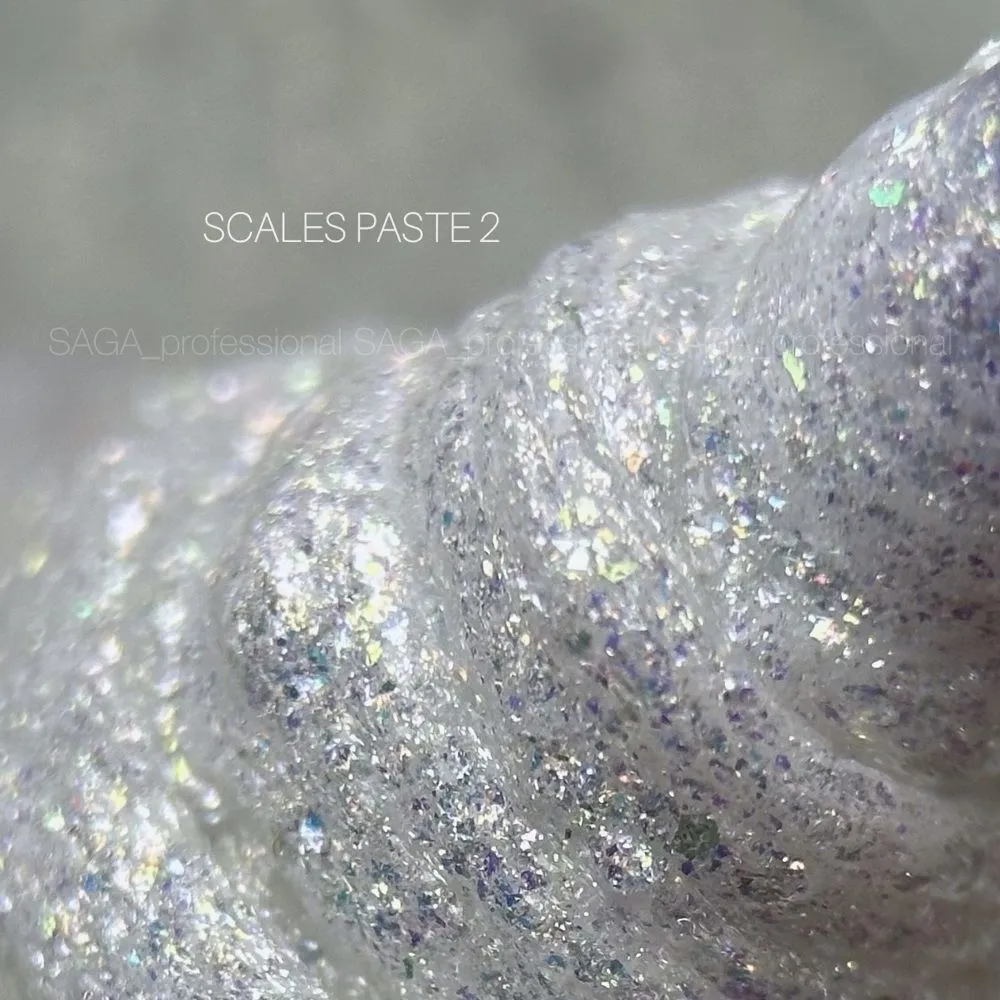 SAGA paste наповнена різнорозмірними блискітками, що нагадують перлинну крихту. Залежно від освітлення частинки переливаються різними відтінками, створюючи перламутровий ефект. Можна застосовувати, щоб робити об`ємні елементи декору: хвилі, краплі, абстракції.